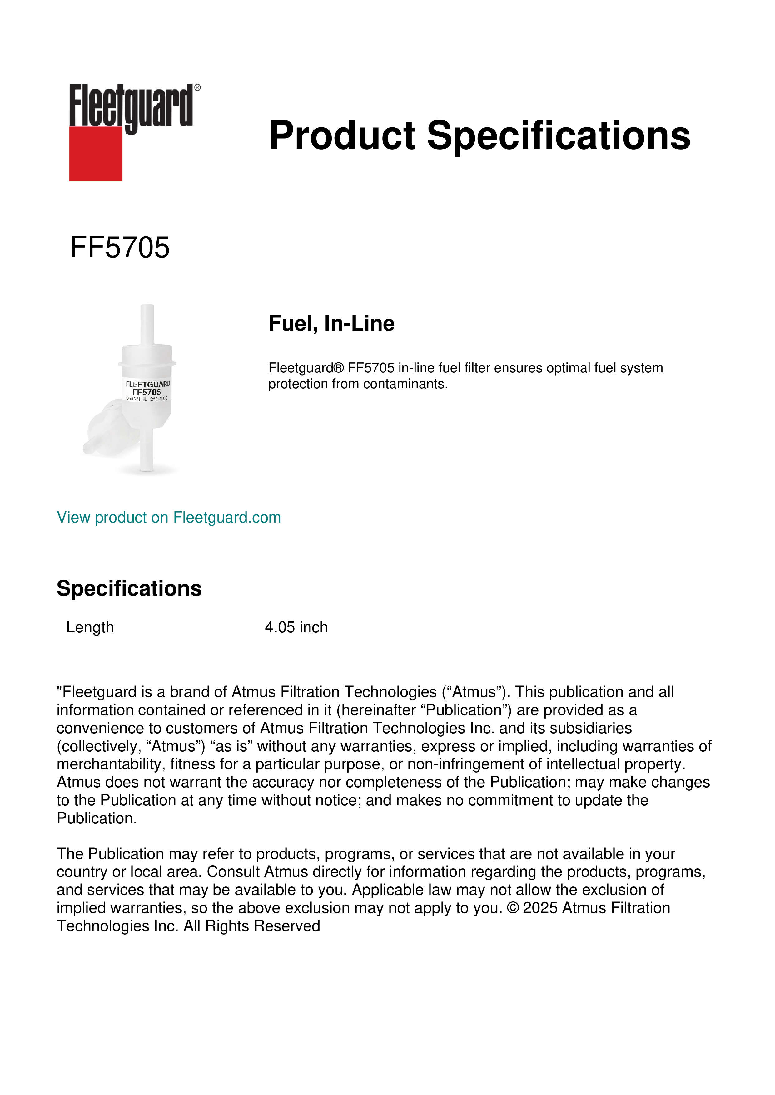 Fleetguard® FF5705 in-line fuel filter ensures optimal fuel system protection from contaminants.Specification