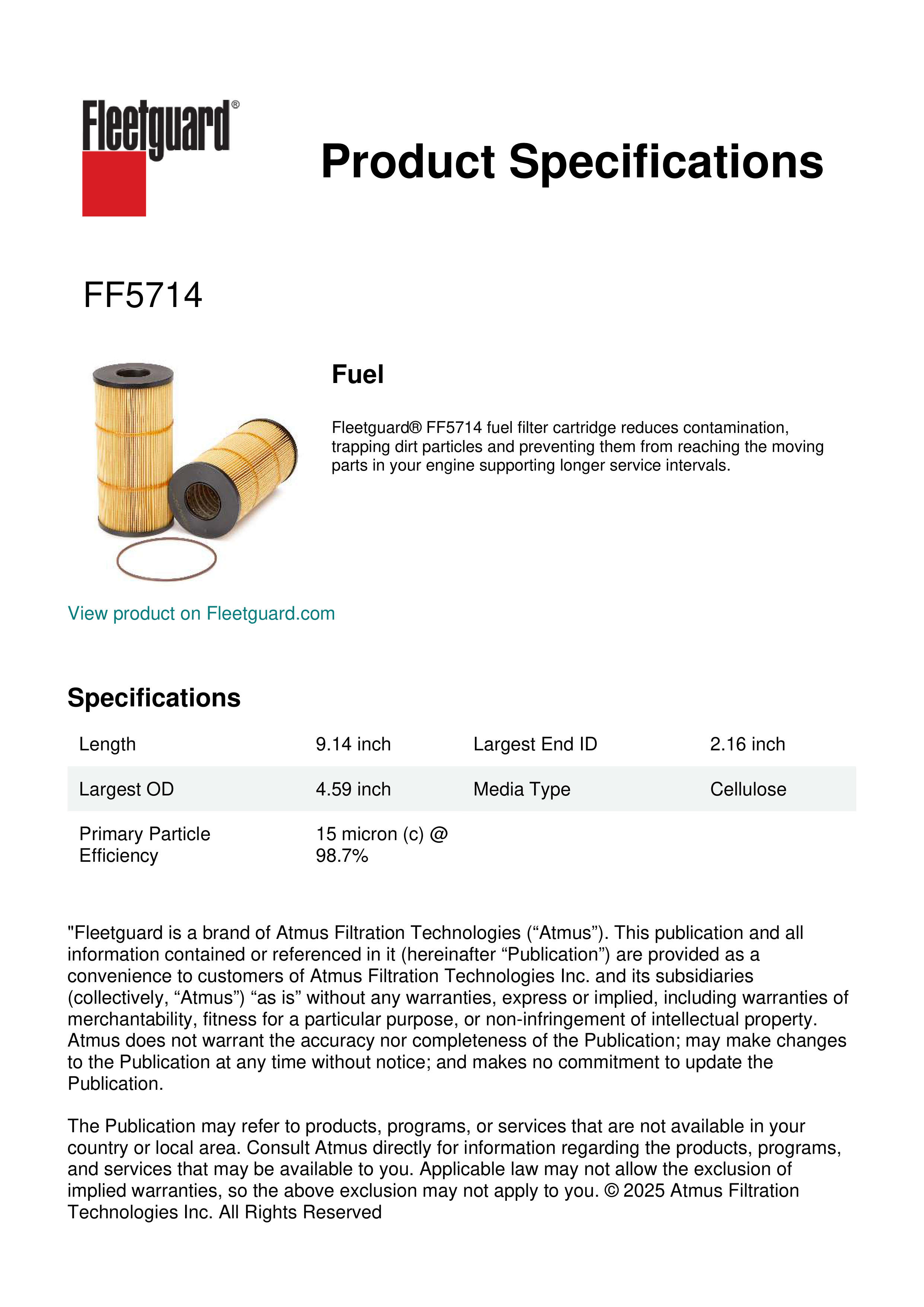 Fleetguard® FF5714 fuel filter cartridge reduces contamination, trapping dirt particles and preventing them from reaching the moving parts in your engine supporting longer service intervals.Specification