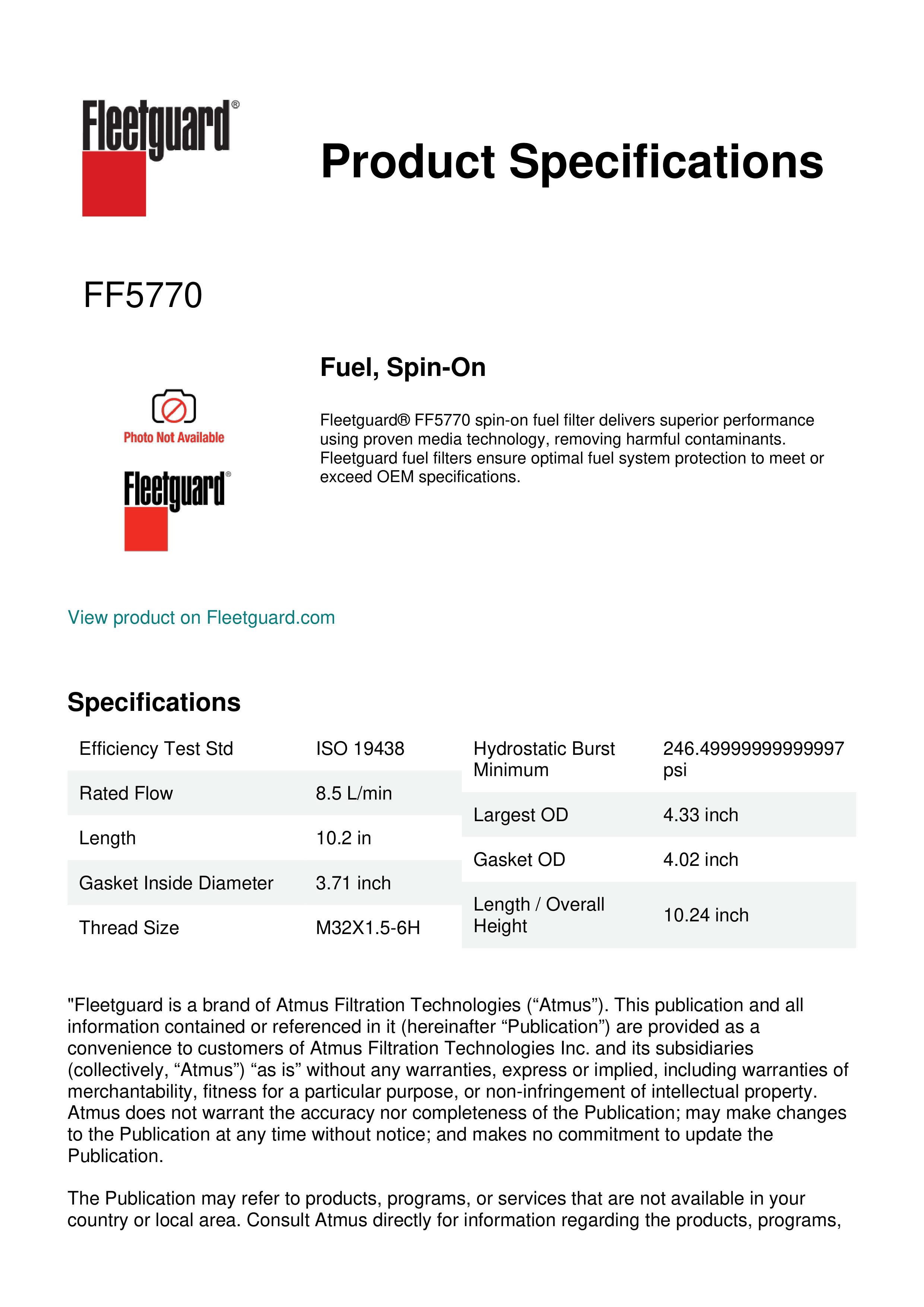 Fleetguard® FF5770 spin-on fuel filter delivers superior performance using proven media technology, removing harmful contaminants. Fleetguard fuel filters ensure optimal fuel system protection to meet or exceed OEM specifications.Specification