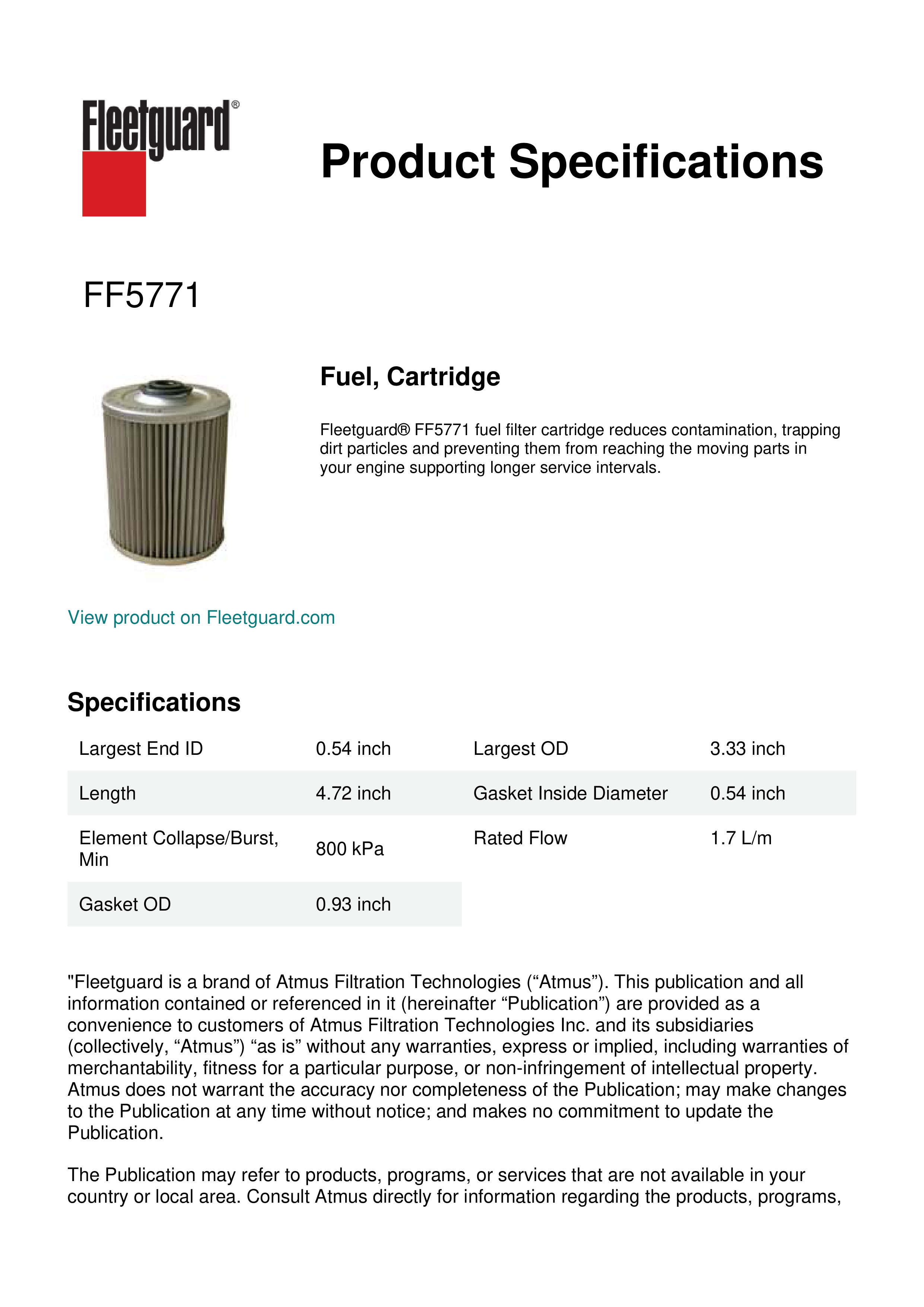 Fleetguard® FF5771 fuel filter cartridge reduces contamination, trapping dirt particles and preventing them from reaching the moving parts in your engine supporting longer service intervals.Specification