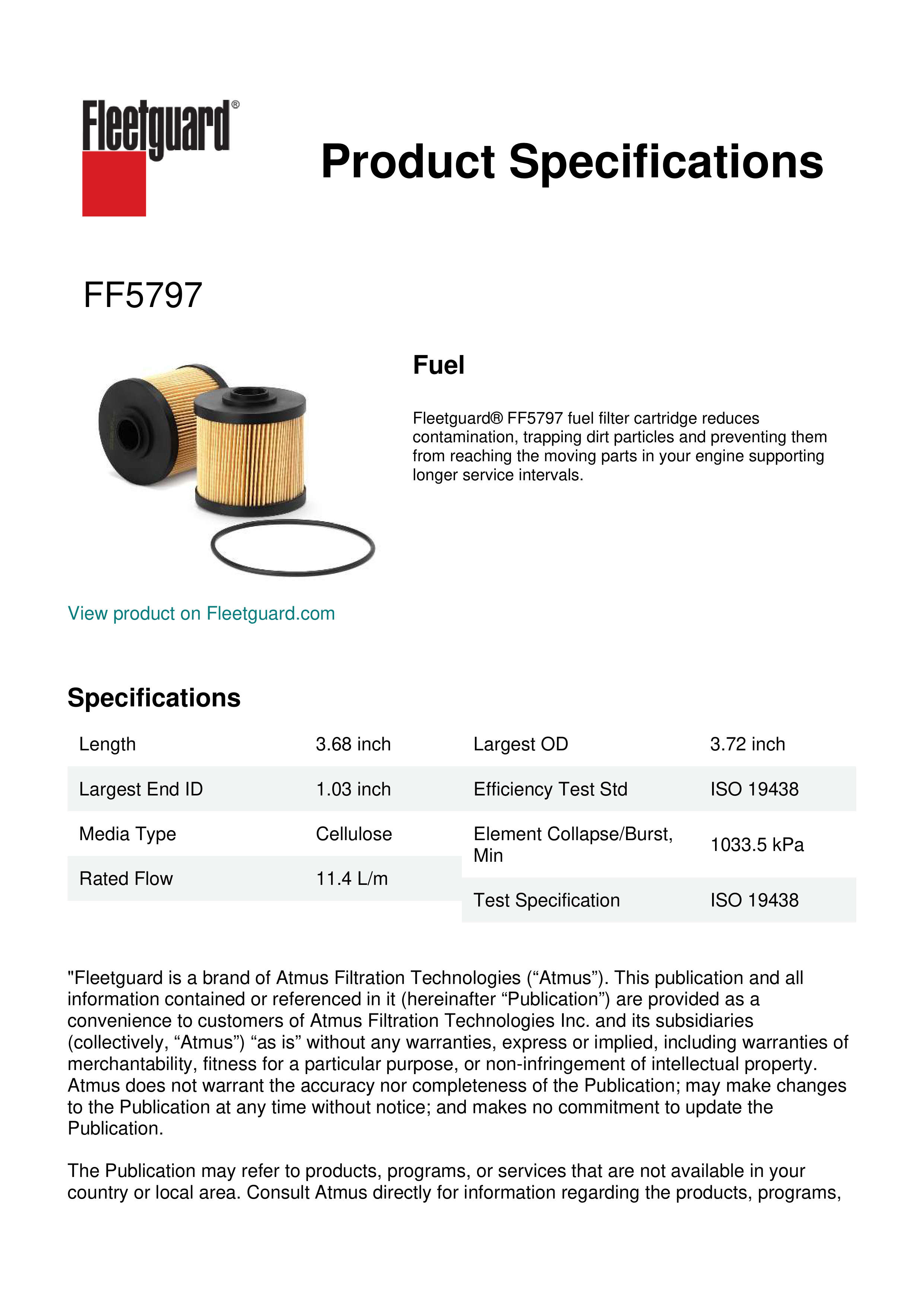 Fleetguard® FF5797 fuel filter cartridge reduces contamination, trapping dirt particles and preventing them from reaching the moving parts in your engine supporting longer service intervals.Specification
