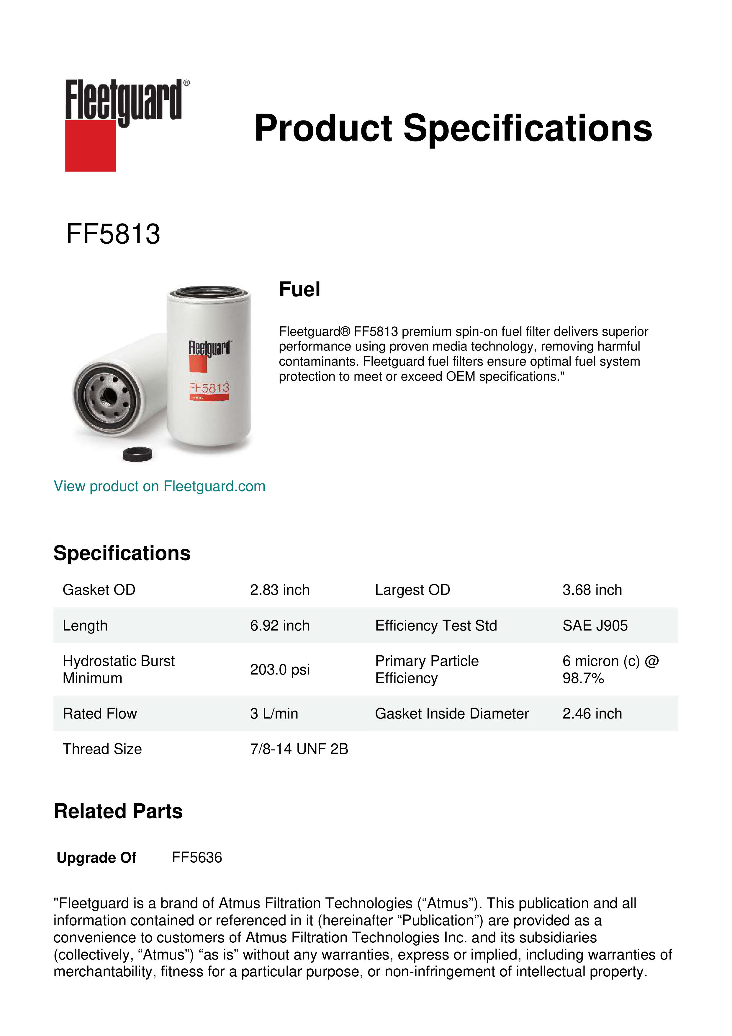 Fleetguard® FF5813 premium spin-on fuel filter delivers superior performance using proven media technology, removing harmful contaminants. Fleetguard fuel filters ensure optimal fuel system protection to meet or exceed OEM specifications."Specification