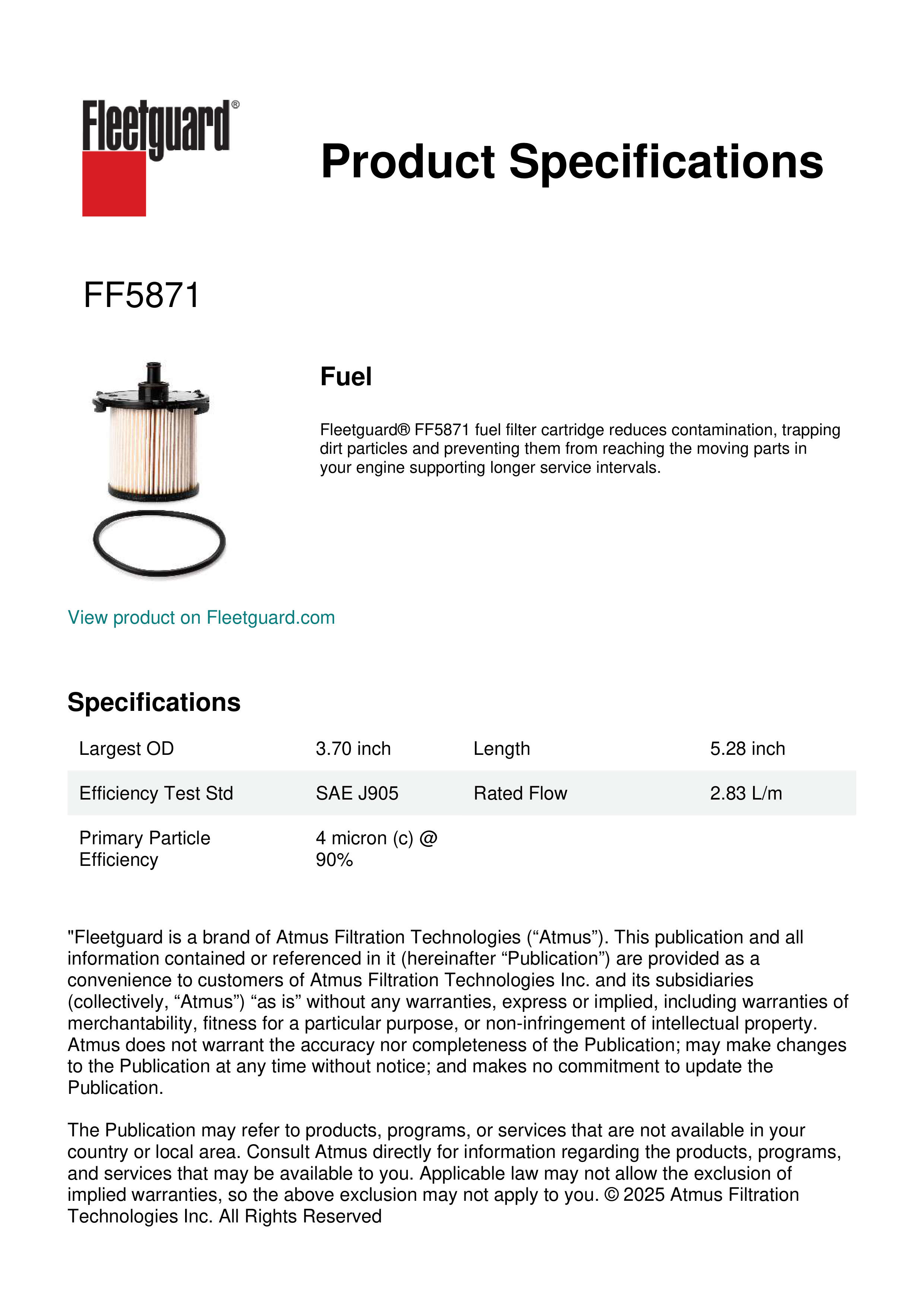 Fleetguard® FF5871 fuel filter cartridge reduces contamination, trapping dirt particles and preventing them from reaching the moving parts in your engine supporting longer service intervals.Specification