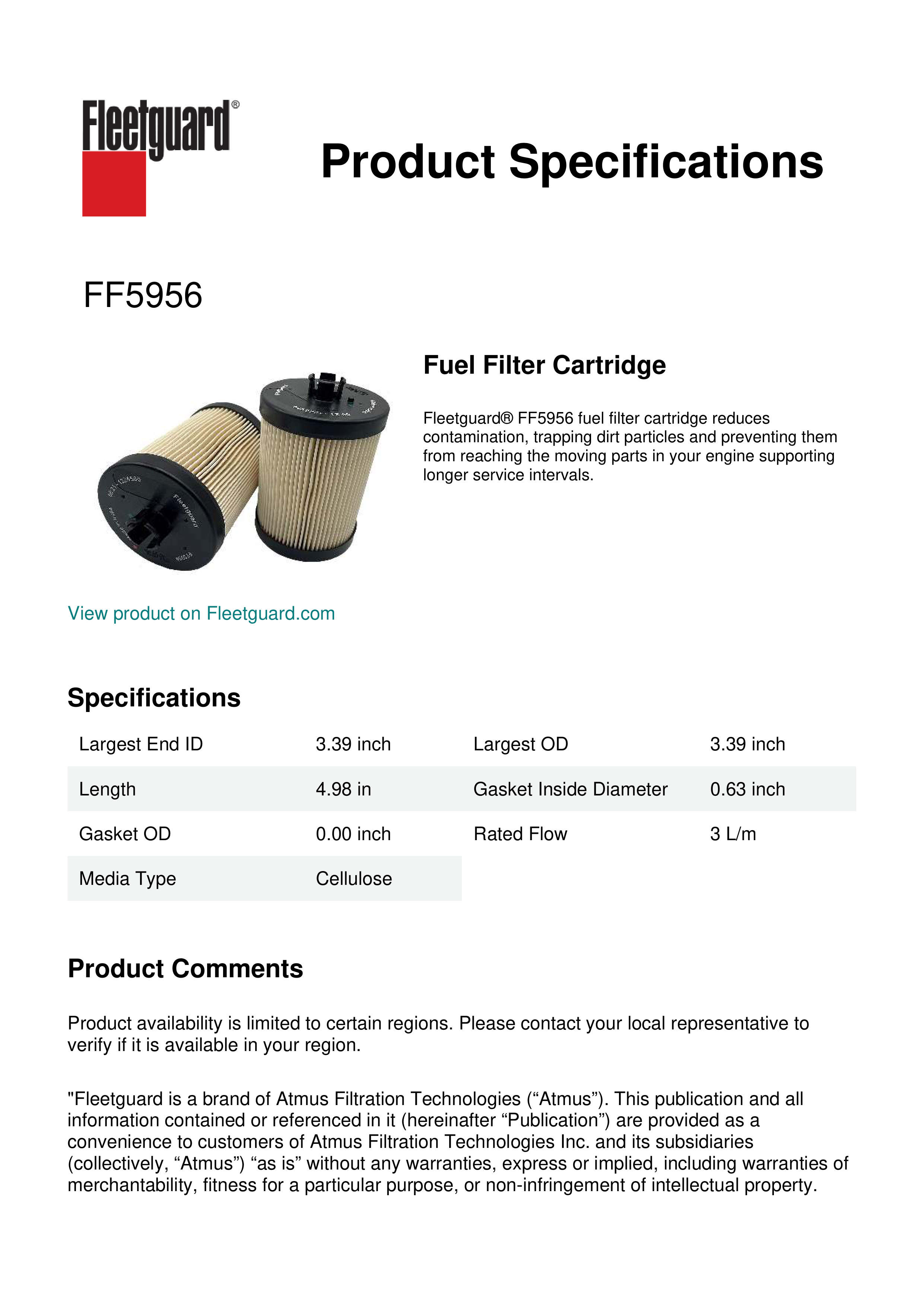 Fleetguard® FF5956 fuel filter cartridge reduces contamination, trapping dirt particles and preventing them from reaching the moving parts in your engine supporting longer service intervals.Specification
