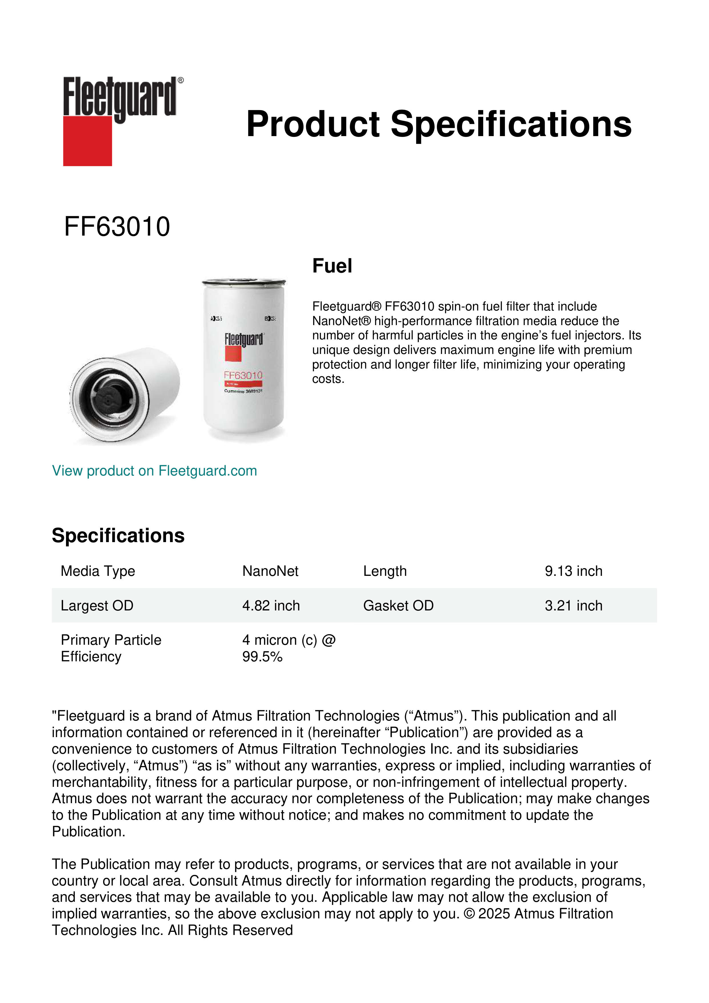 Fleetguard® FF63010 spin-on fuel filter that include NanoNet® high-performance filtration media reduce the number of harmful particles in the engine’s fuel injectors. Its unique design delivers maximum engine life with premium protection and longer filter life, minimizing your operating costs.Specification