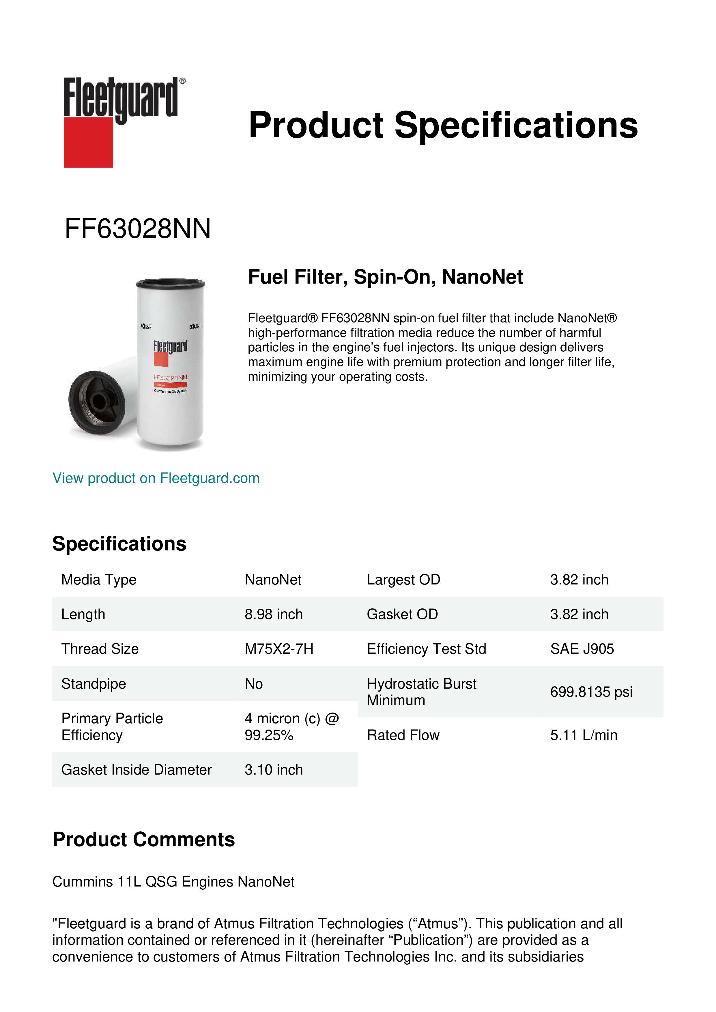 Fleetguard® FF63028NN spin-on fuel filter that include NanoNet® high-performance filtration media reduce the number of harmful particles in the engine’s fuel injectors. Its unique design delivers maximum engine life with premium protection and longer filter life, minimizing your operating costs.Specification