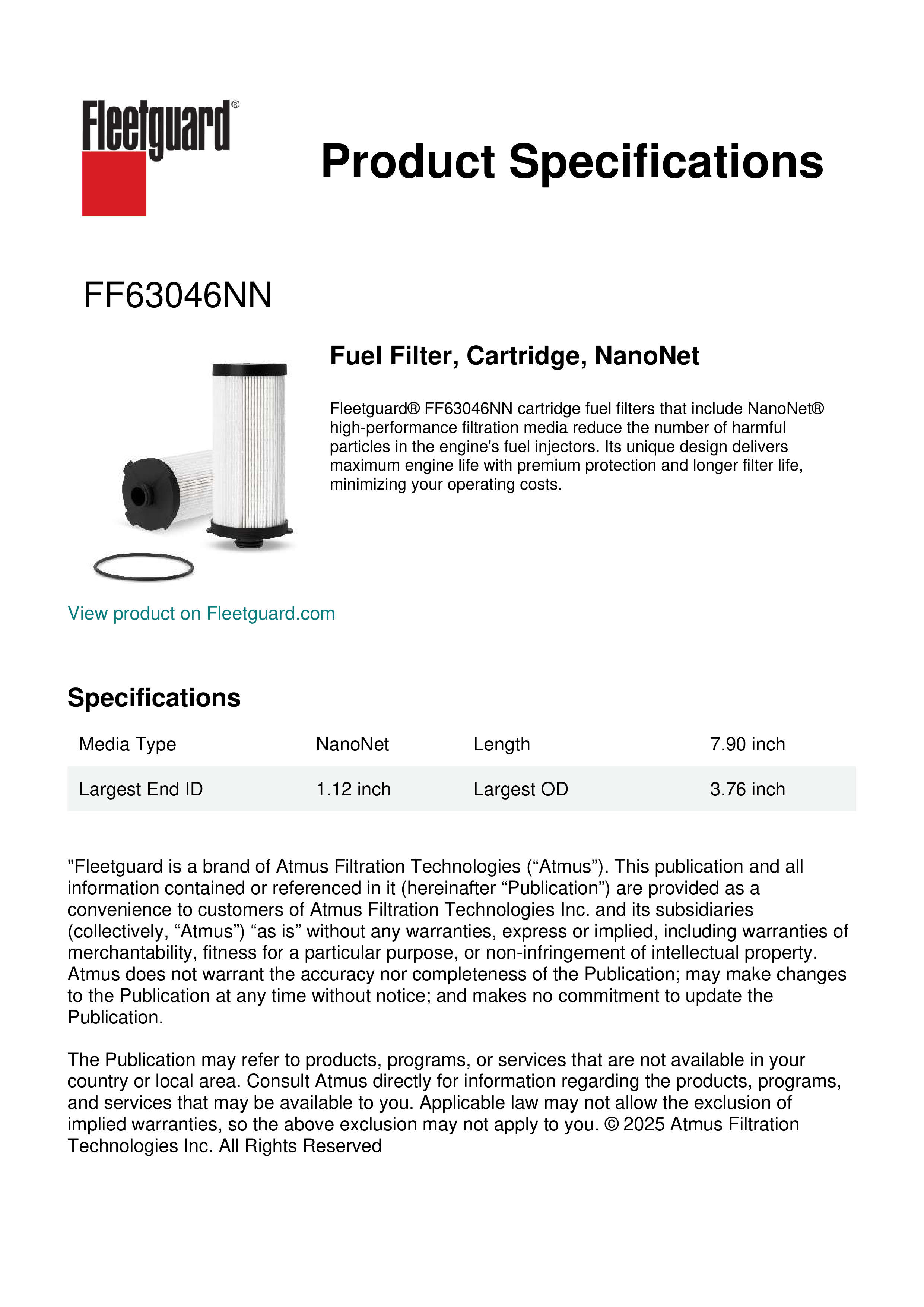 Fleetguard® FF63046NN cartridge fuel filters that include NanoNet® high-performance filtration media reduce the number of harmful particles in the engine's fuel injectors. Its unique design delivers maximum engine life with premium protection and longer filter life, minimizing your operating costs.Specification