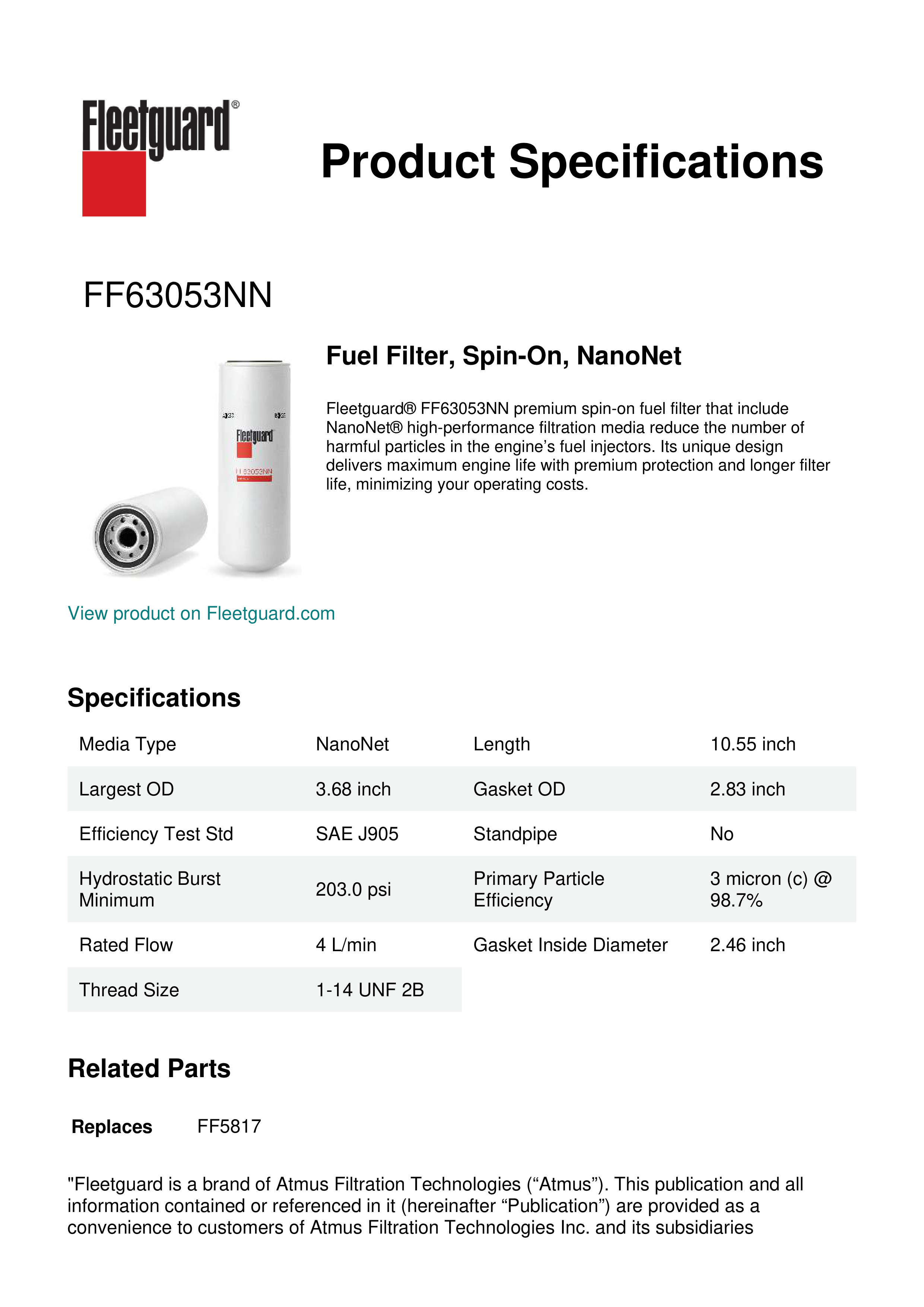 Fleetguard® FF63053NN premium spin-on fuel filter that include NanoNet® high-performance filtration media reduce the number of harmful particles in the engine’s fuel injectors. Its unique design delivers maximum engine life with premium protection and longer filter life, minimizing your operating costs.Specification