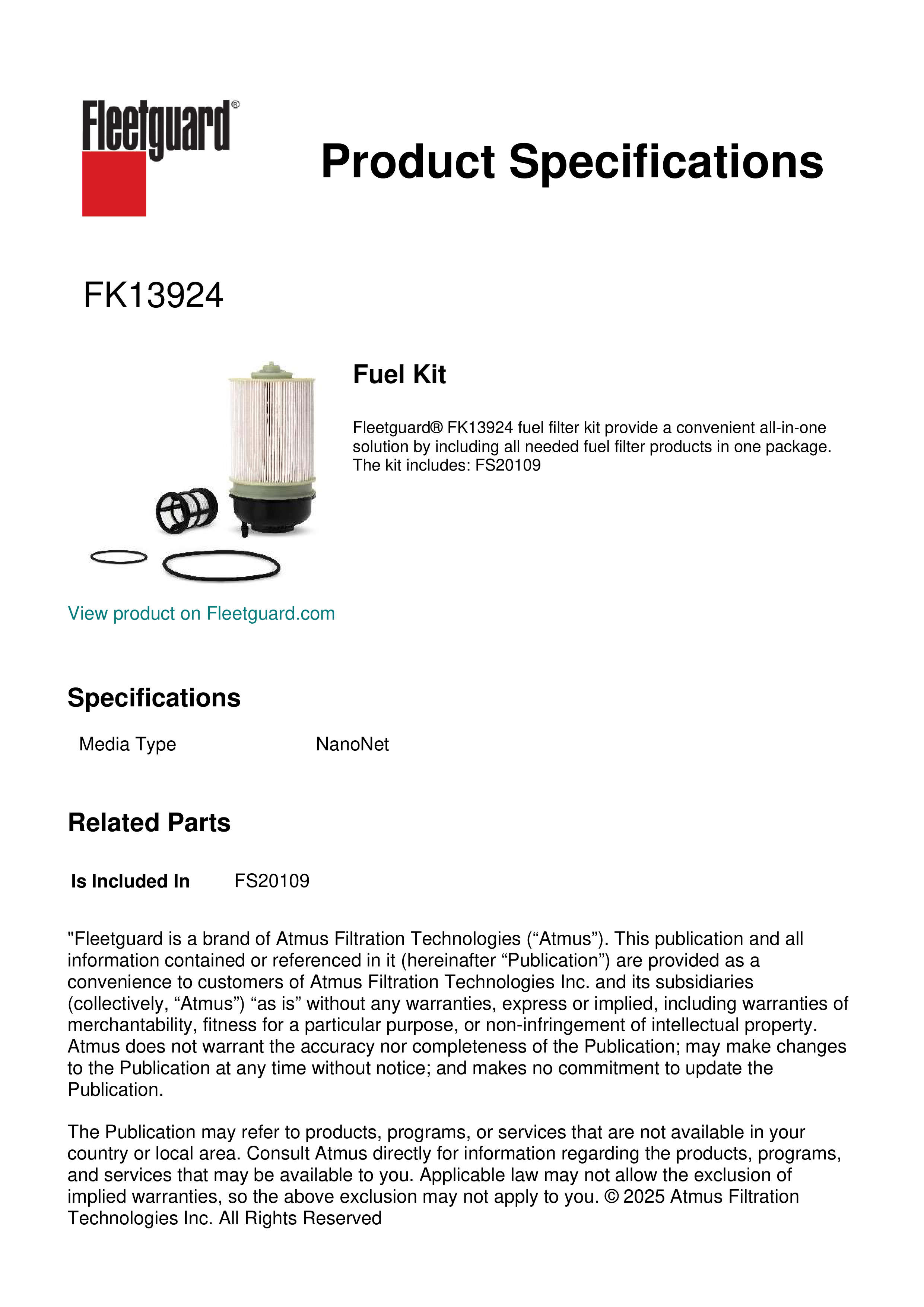 Fleetguard® FK13924 fuel filter kit provide a convenient all-in-one solution by including all needed fuel filter products in one package. The kit includes: FS20109Specification