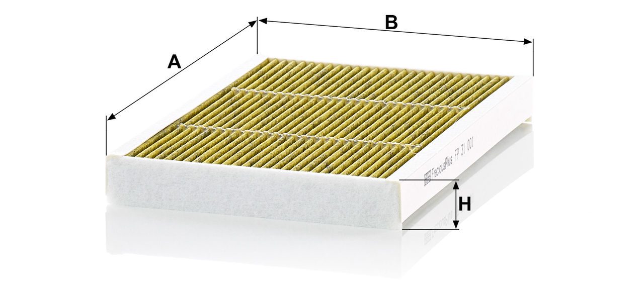 Biofunctional MANN-FILTER FreciousPlus cabin air filters - nearly 100% protection against nitrogen oxides, dust, allergens and mould - harmful gases and unpleasant odours are also eliminated and virus aerosols filtered. The three-layer filter technology absorbs almost 100% of allergens, reduces the growth of molds and bacteria by more than 98% and stops fine dust almost completely.Specification