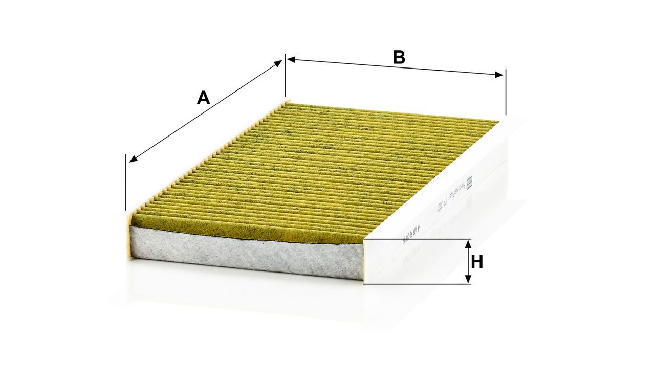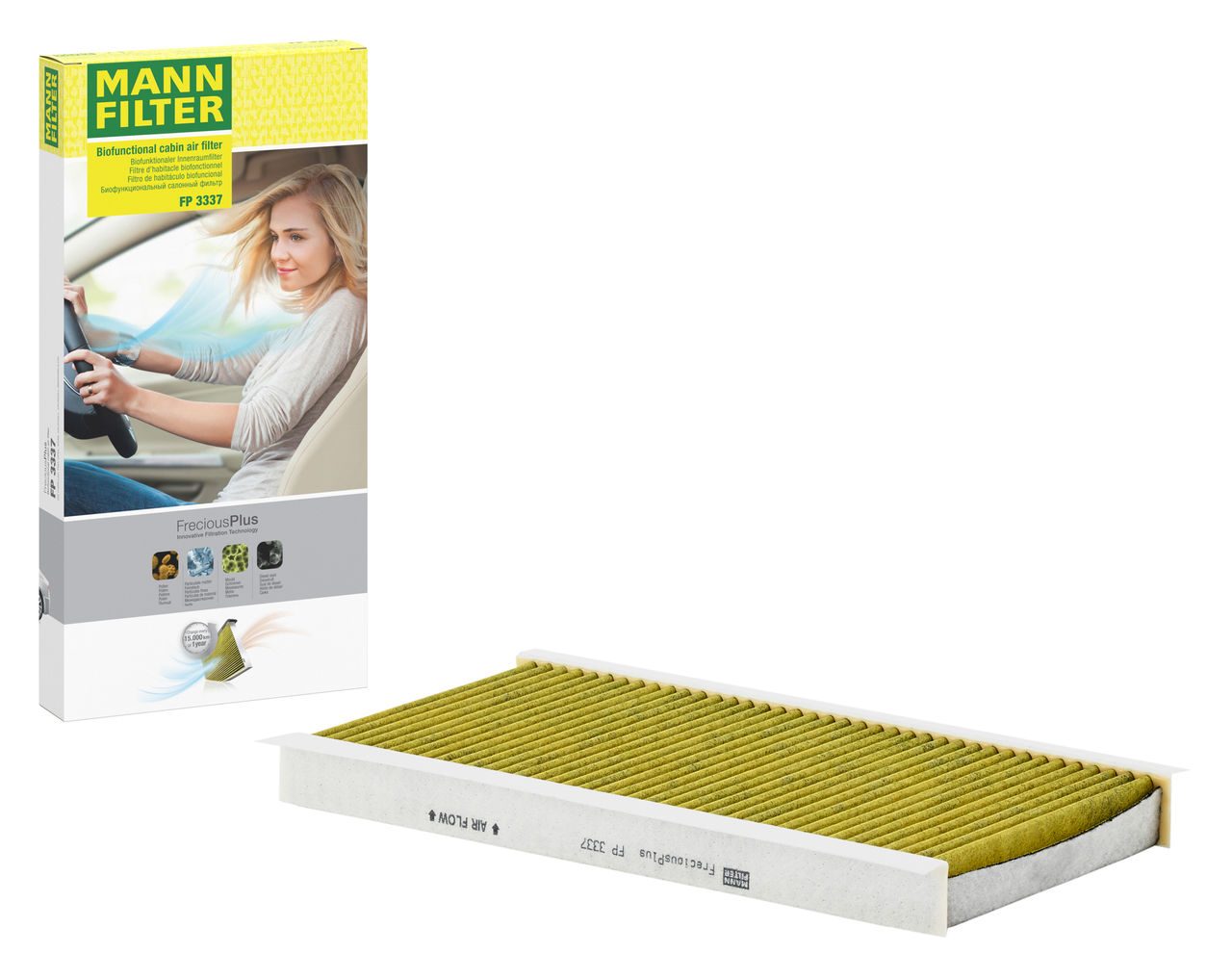 Biofunctional MANN-FILTER FreciousPlus cabin air filters - nearly 100% protection against nitrogen oxides, dust, allergens and mould - harmful gases and unpleasant odours are also eliminated and virus aerosols filtered. The three-layer filter technology absorbs almost 100% of allergens, reduces the growth of molds and bacteria by more than 98% and stops fine dust almost completely.Specification
