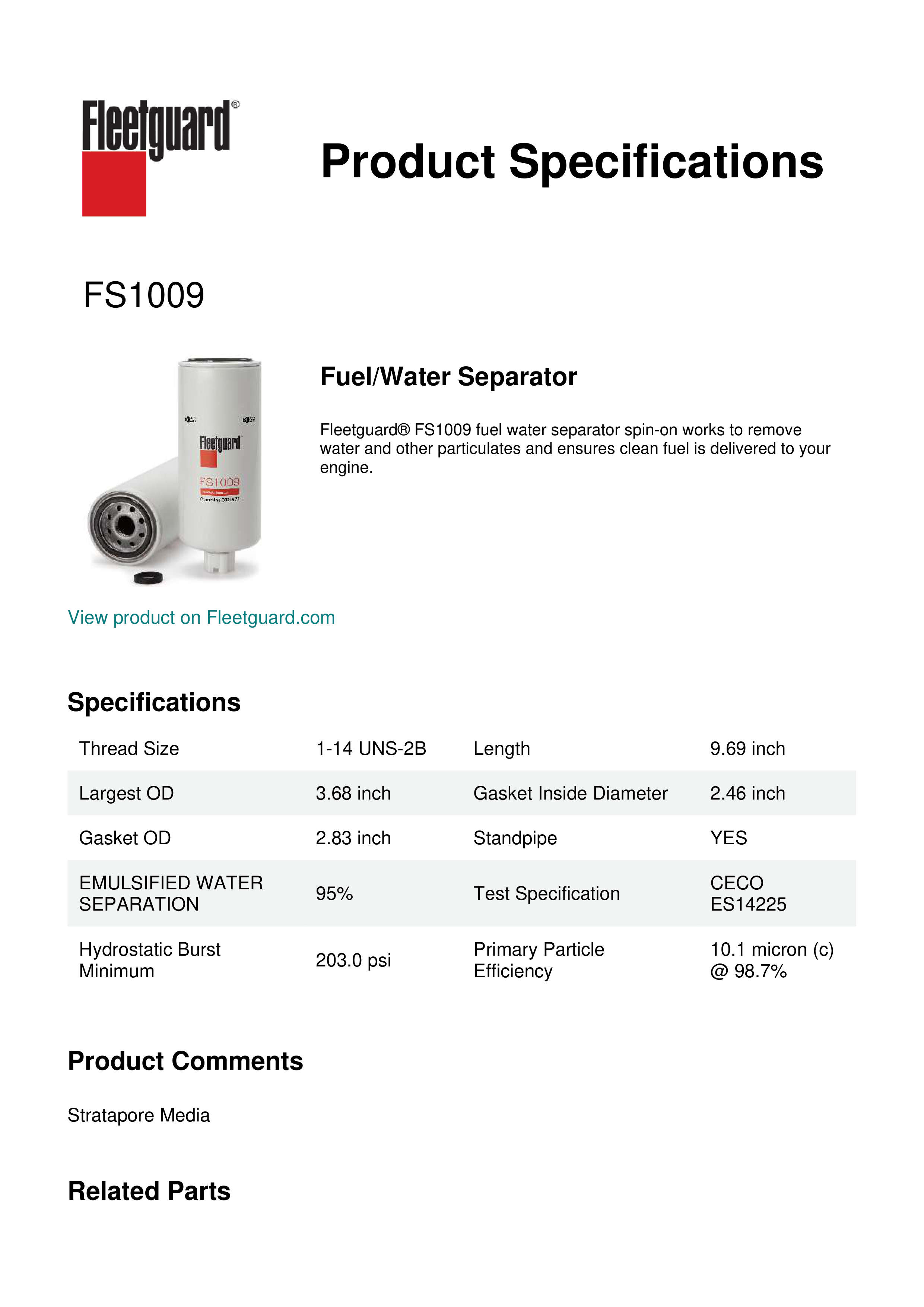 Fleetguard® FS1009 fuel water separator spin-on works to remove water and other particulates and ensures clean fuel is delivered to your engine.Specification