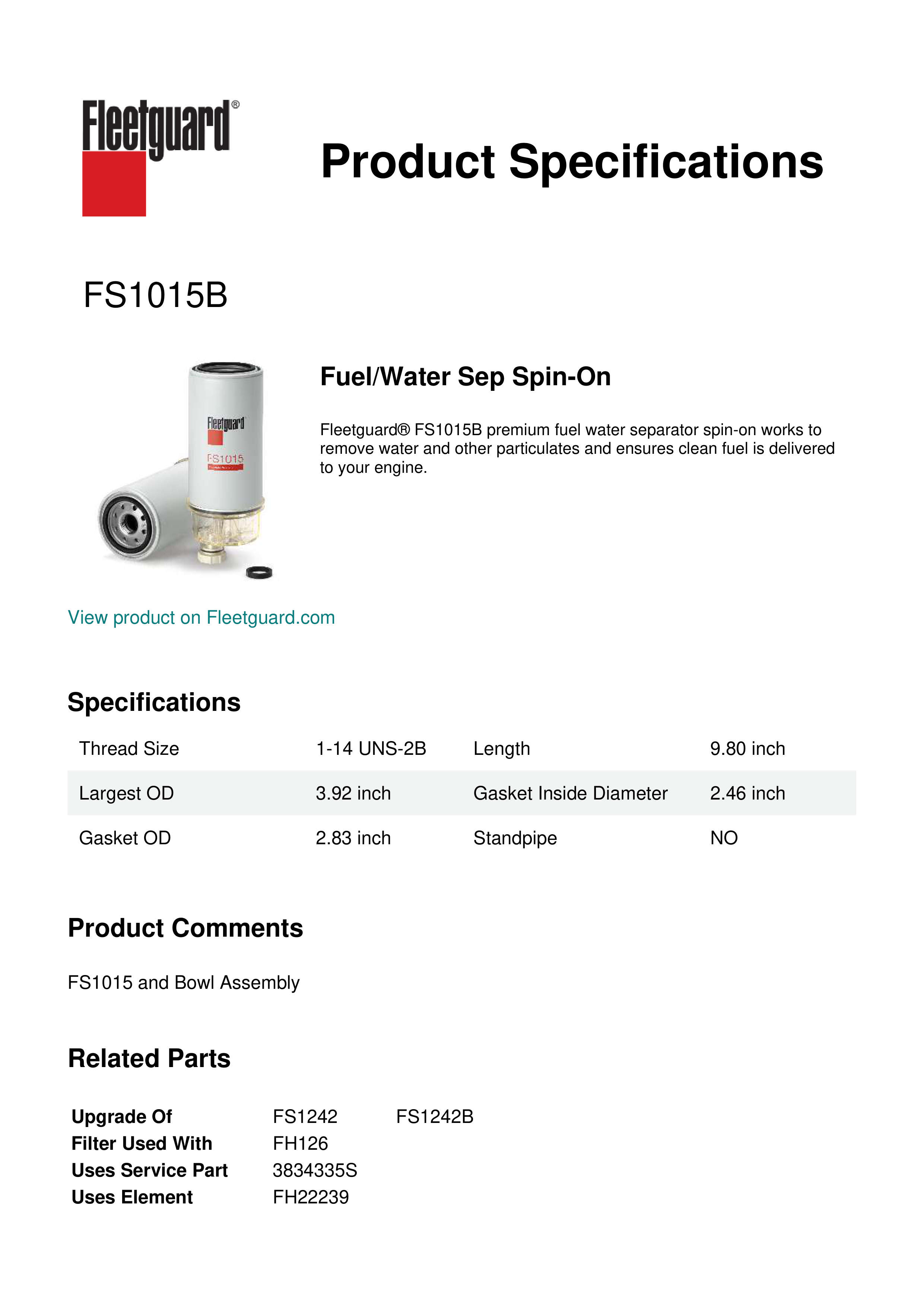 Fleetguard® FS1015B premium fuel water separator spin-on works to remove water and other particulates and ensures clean fuel is delivered to your engine.Specification