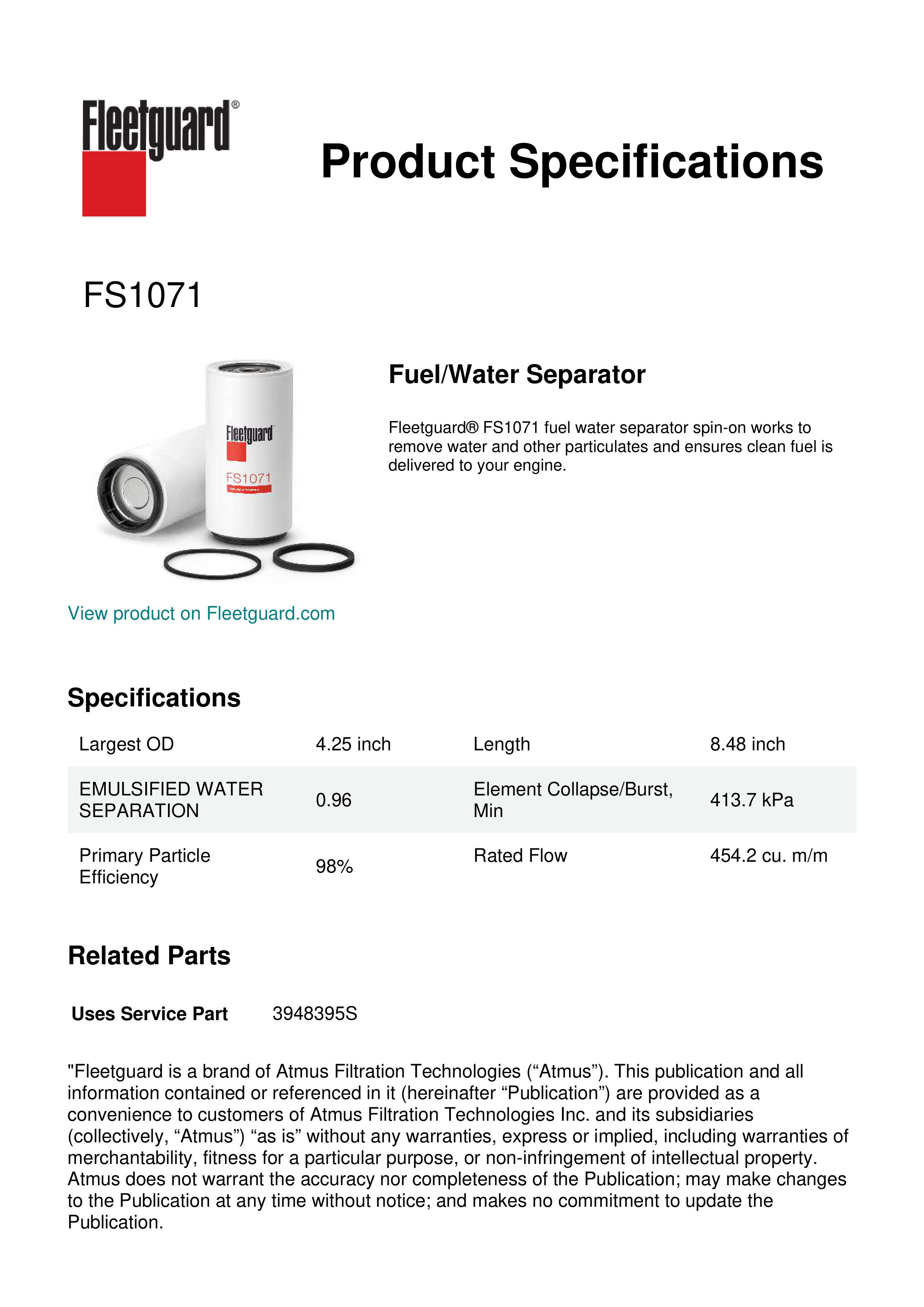 Fleetguard® FS1071 fuel water separator spin-on works to remove water and other particulates and ensures clean fuel is delivered to your engine.Specification