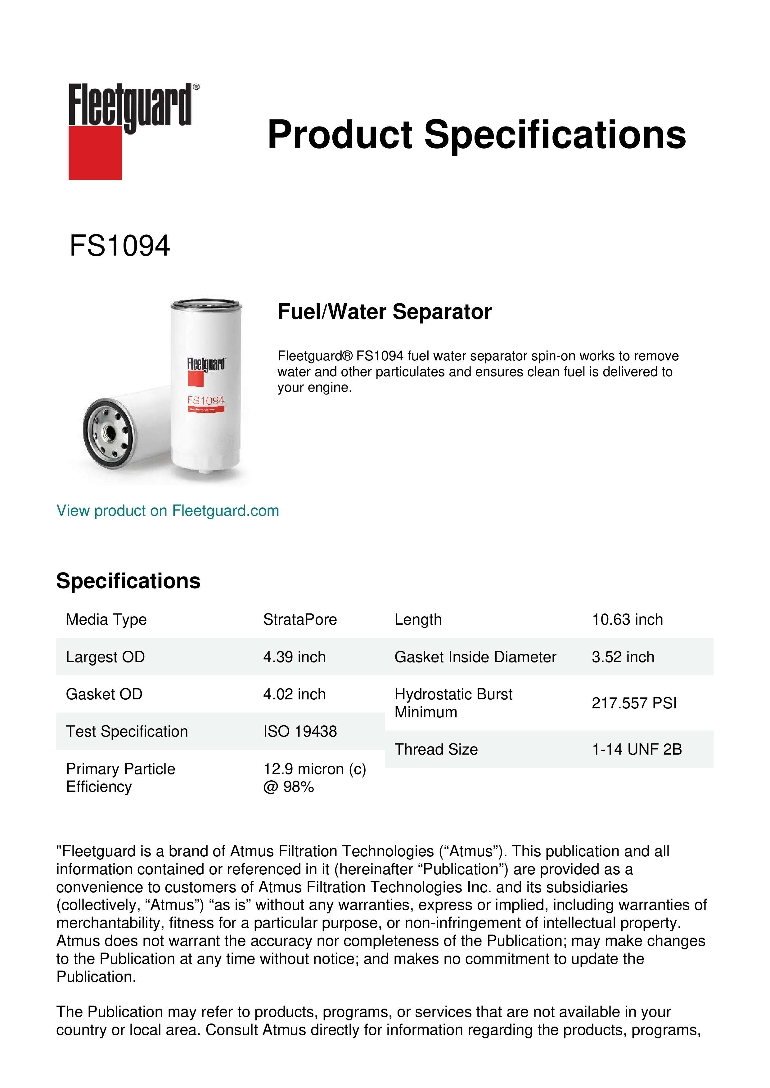 Fleetguard® FS1094 fuel water separator spin-on works to remove water and other particulates and ensures clean fuel is delivered to your engine.Specification