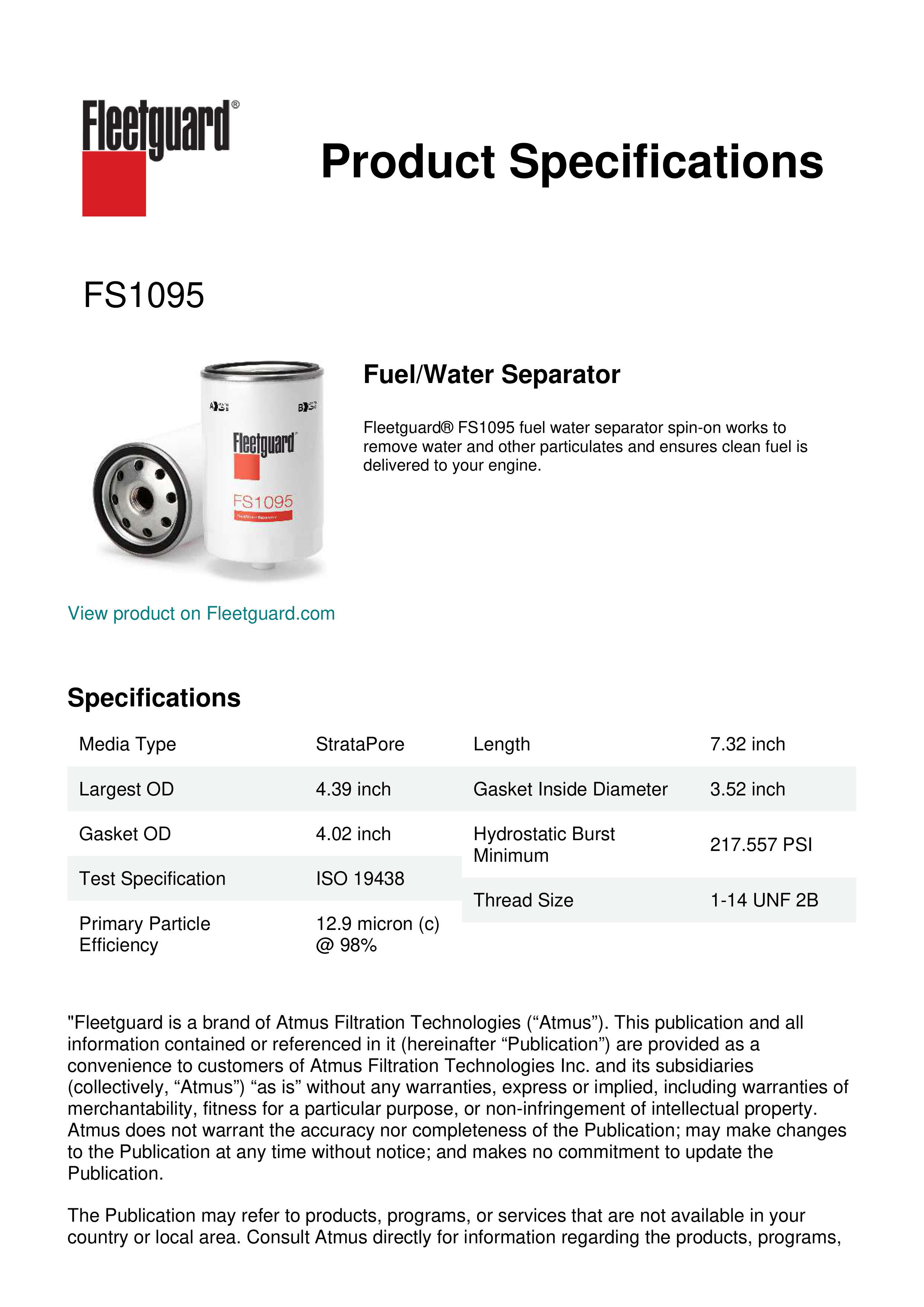 Fleetguard® FS1095 fuel water separator spin-on works to remove water and other particulates and ensures clean fuel is delivered to your engine.Specification