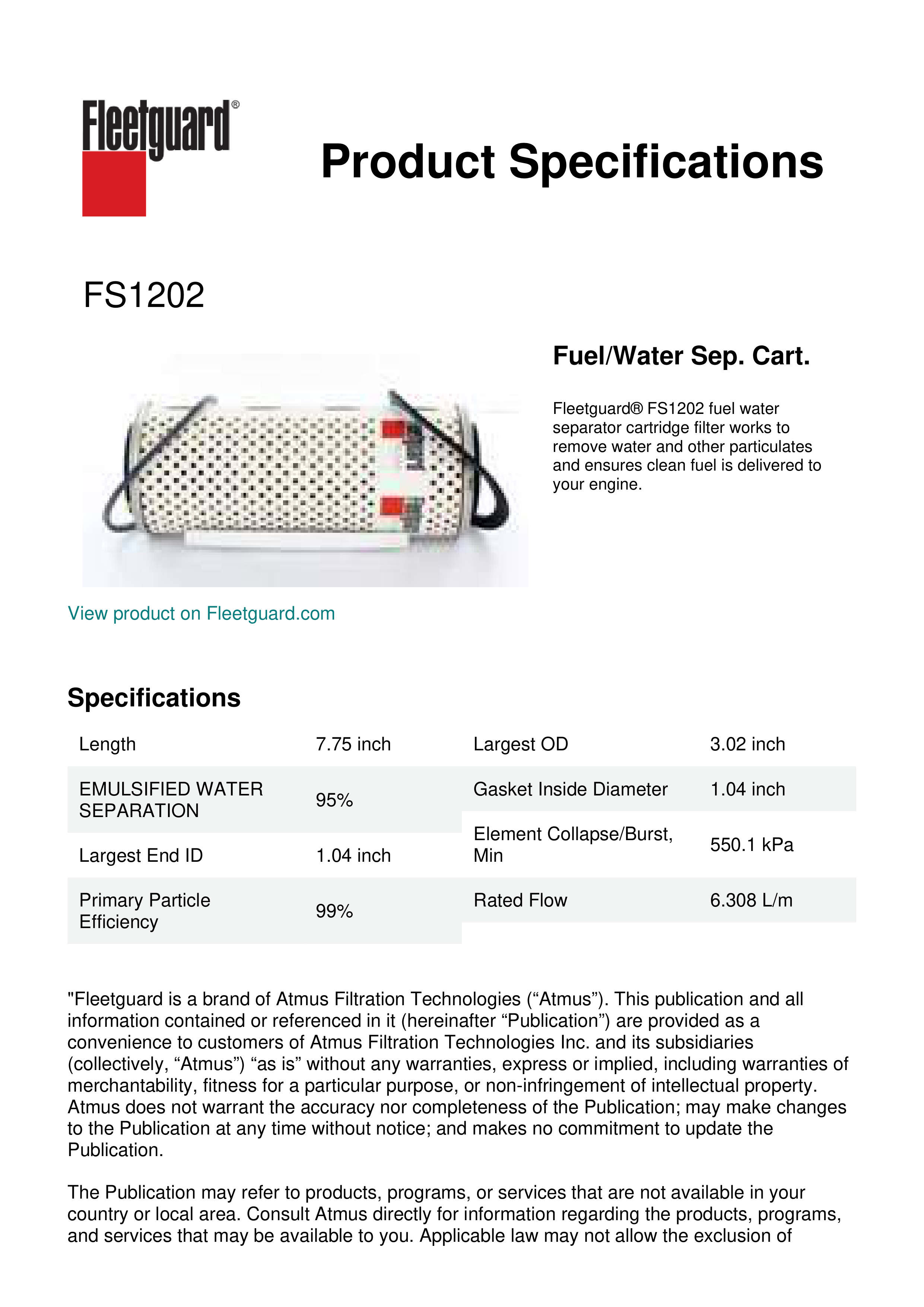 Fleetguard® FS1202 fuel water separator cartridge filter works to remove water and other particulates and ensures clean fuel is delivered to your engine.Specification