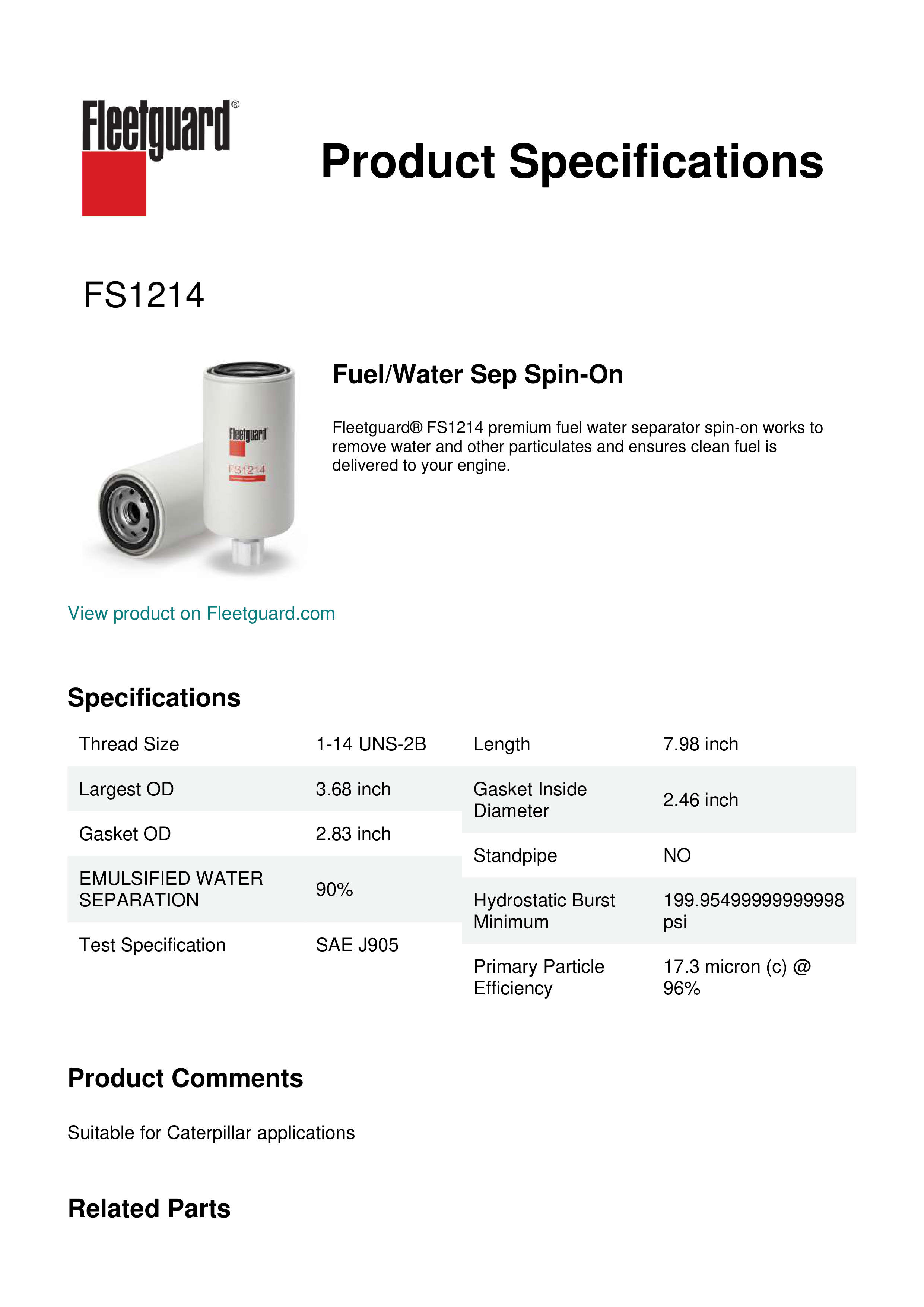 Fleetguard® FS1214 premium fuel water separator spin-on works to remove water and other particulates and ensures clean fuel is delivered to your engine.Specification