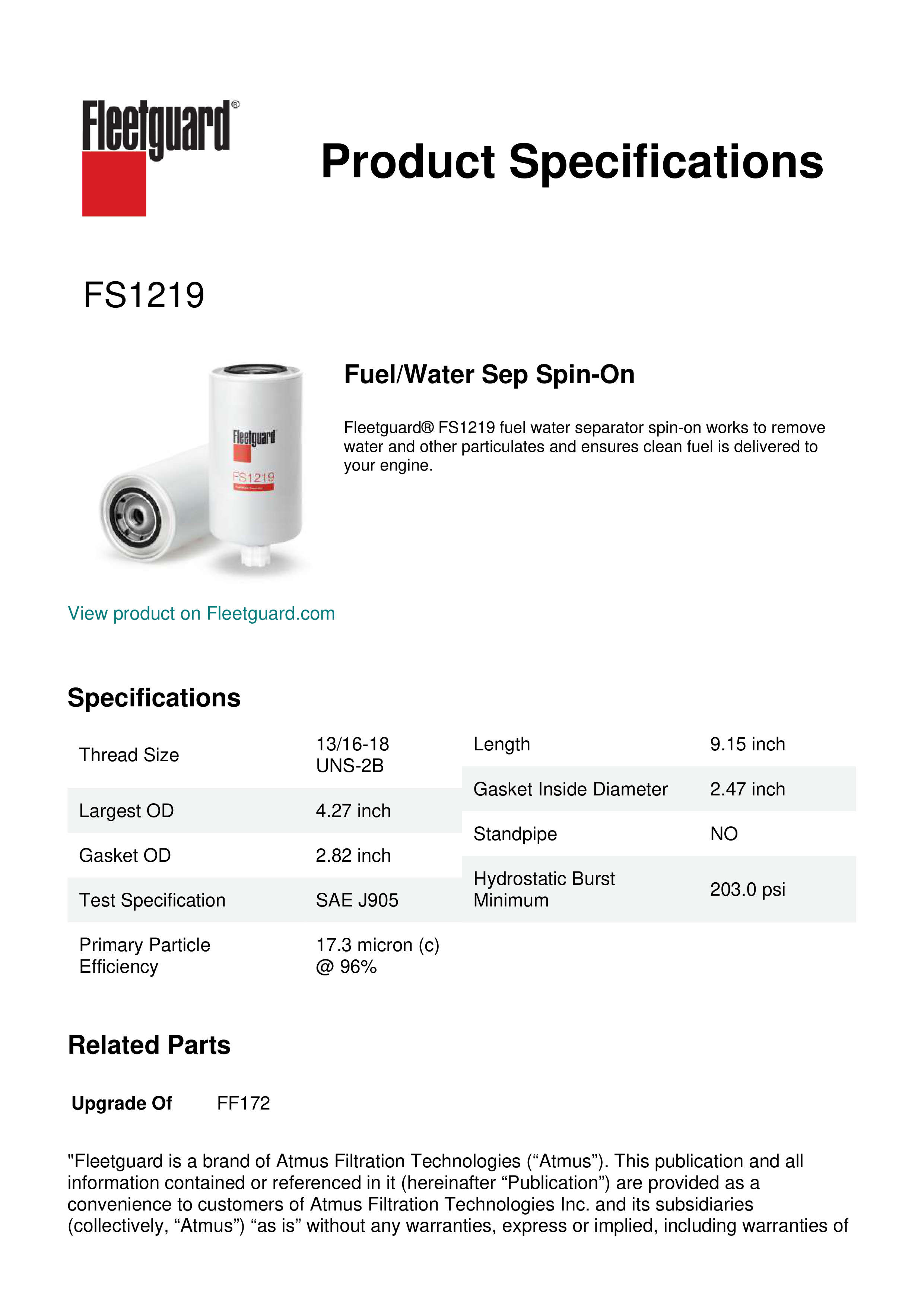 Fleetguard® FS1219 fuel water separator spin-on works to remove water and other particulates and ensures clean fuel is delivered to your engine.Specification