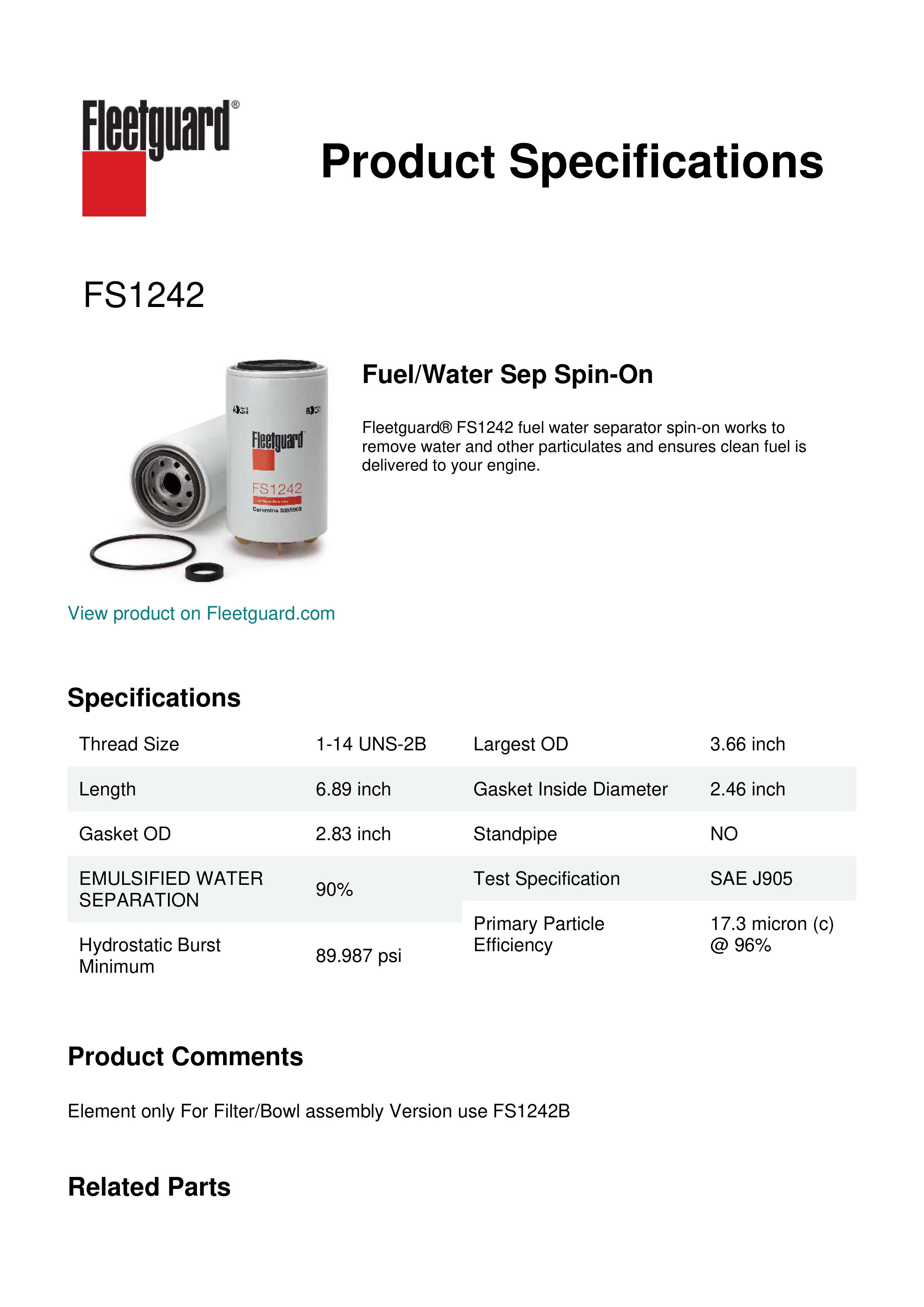 Fleetguard® FS1242 fuel water separator spin-on works to remove water and other particulates and ensures clean fuel is delivered to your engine.Specification