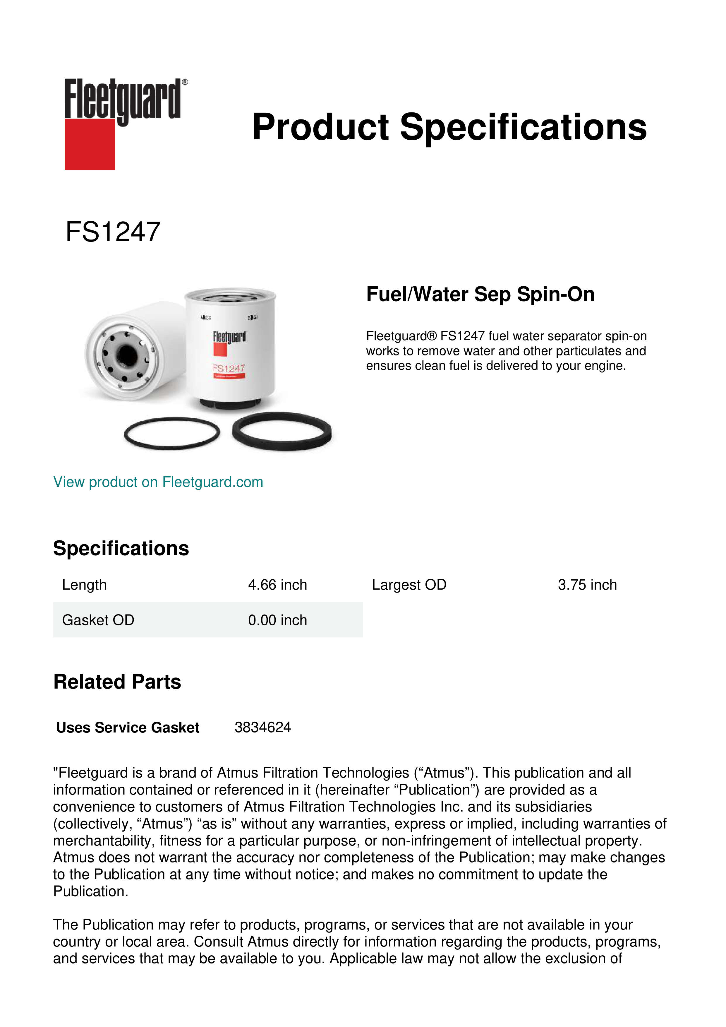 Fleetguard® FS1247 fuel water separator spin-on works to remove water and other particulates and ensures clean fuel is delivered to your engine.Specification