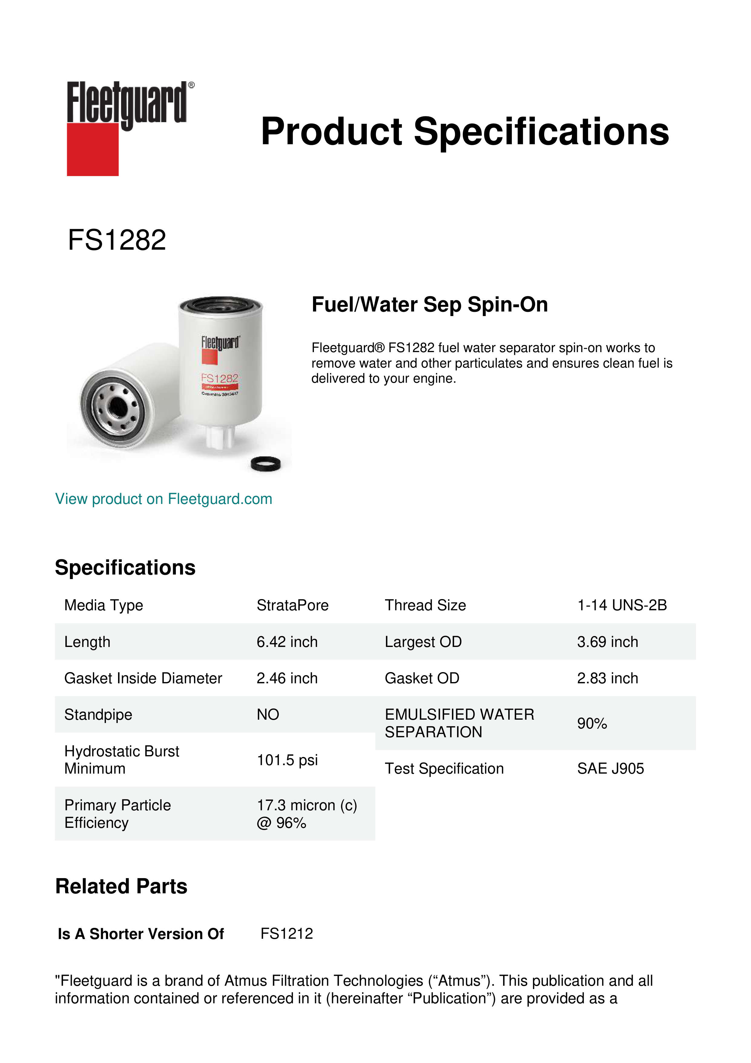 Fleetguard® FS1282 fuel water separator spin-on works to remove water and other particulates and ensures clean fuel is delivered to your engine.Specification