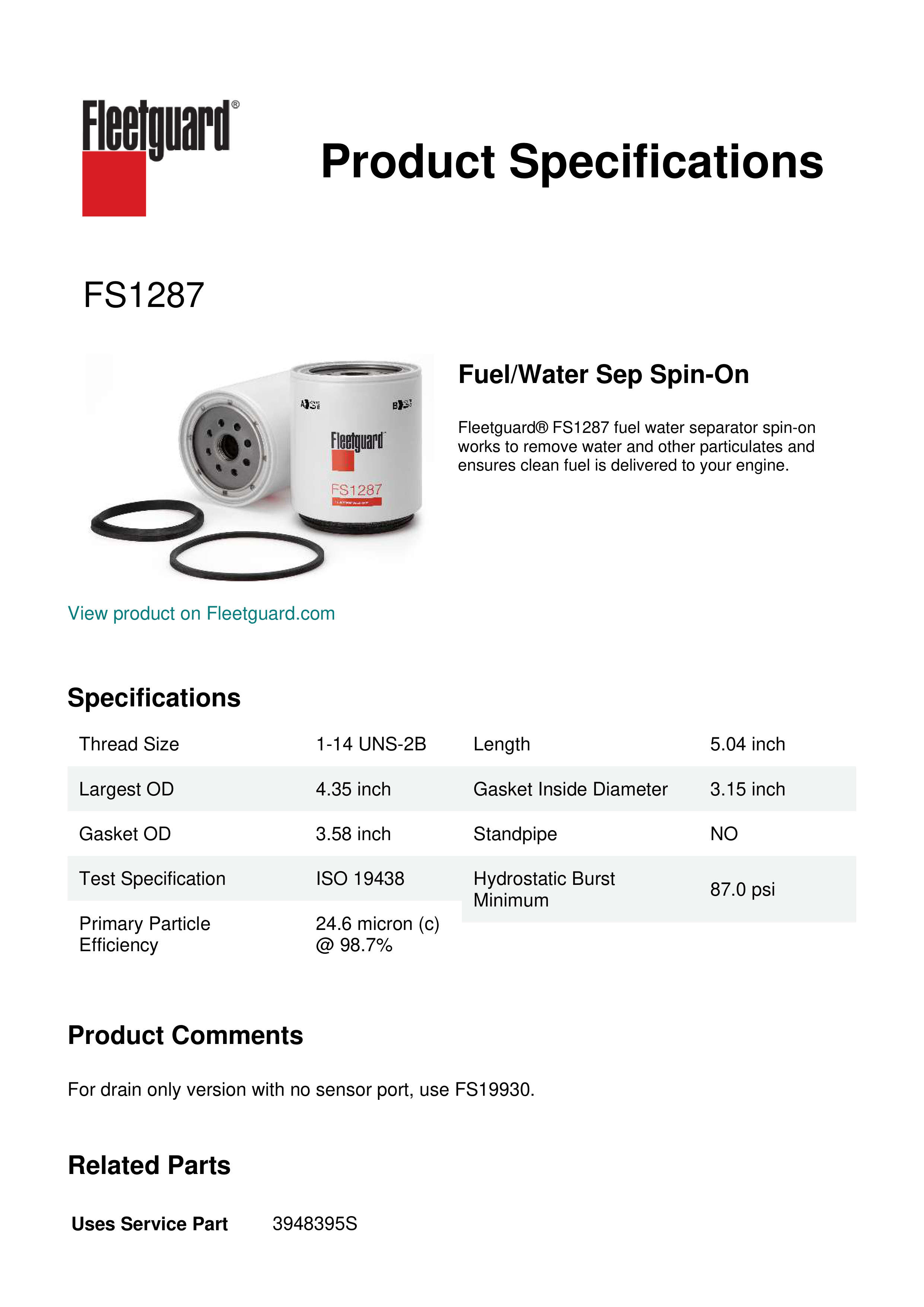 Fleetguard® FS1287 fuel water separator spin-on works to remove water and other particulates and ensures clean fuel is delivered to your engine.Specification