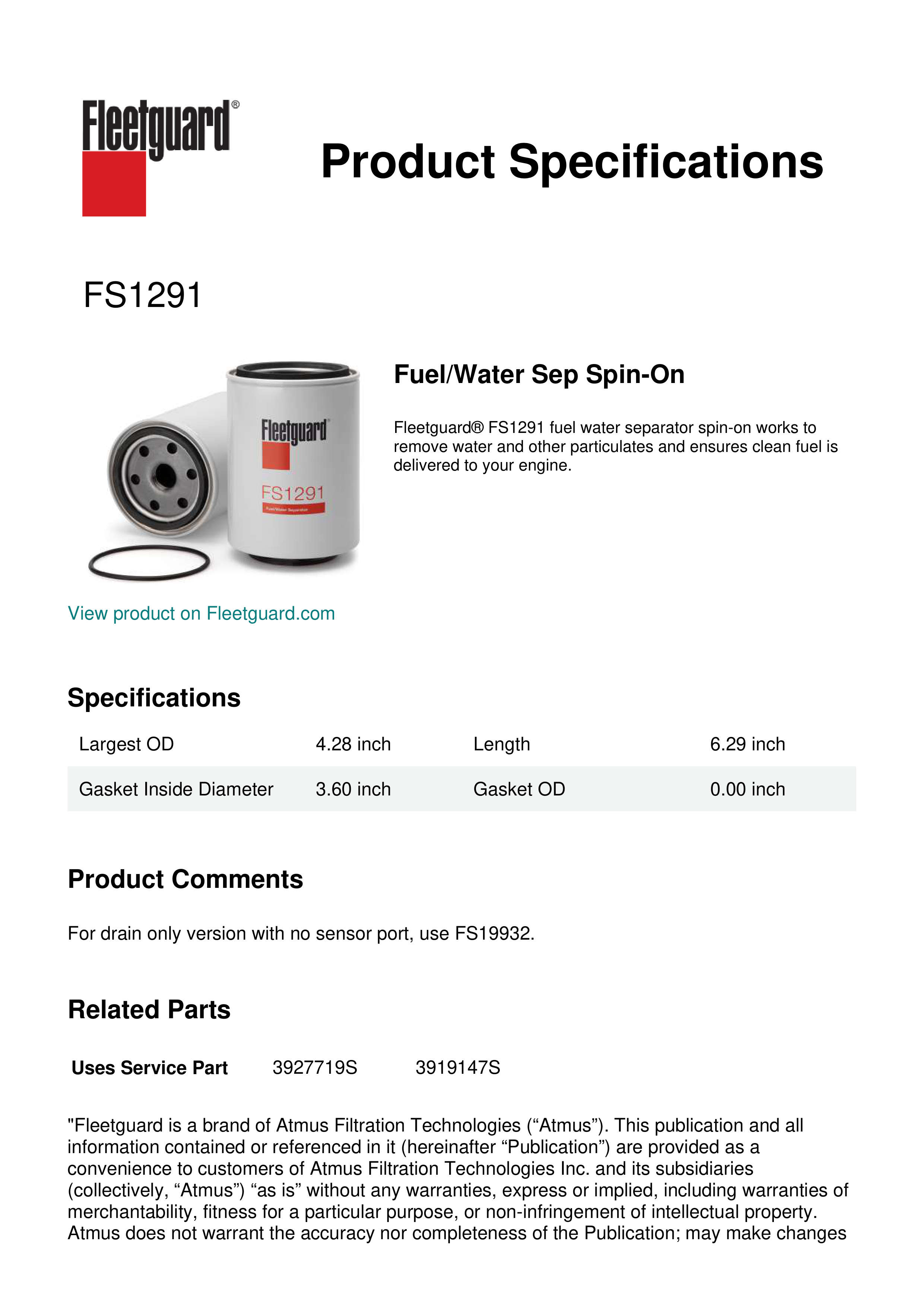 Fleetguard® FS1291 fuel water separator spin-on works to remove water and other particulates and ensures clean fuel is delivered to your engine.Specification
