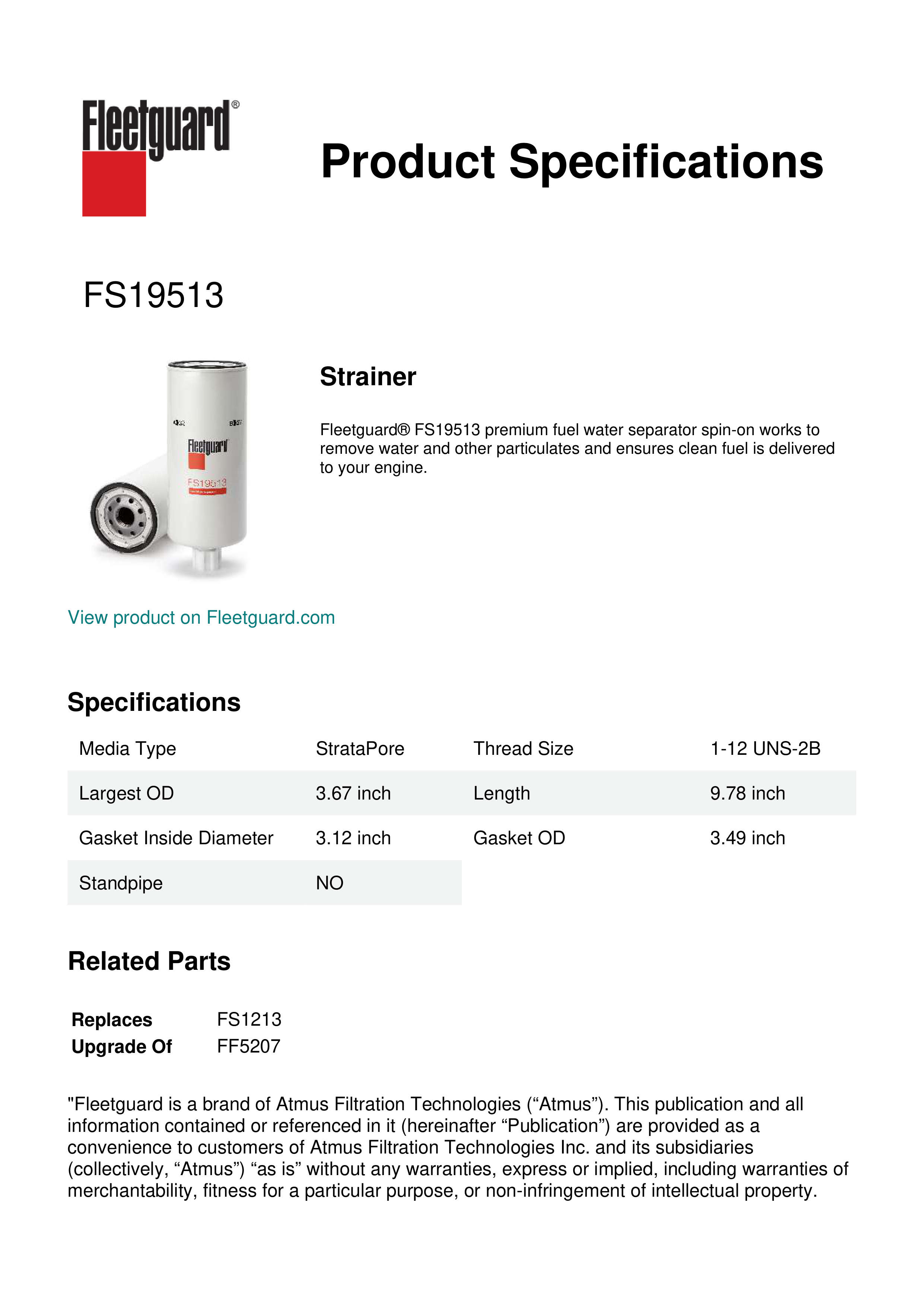 Fleetguard® FS19513 premium fuel water separator spin-on works to remove water and other particulates and ensures clean fuel is delivered to your engine.Specification