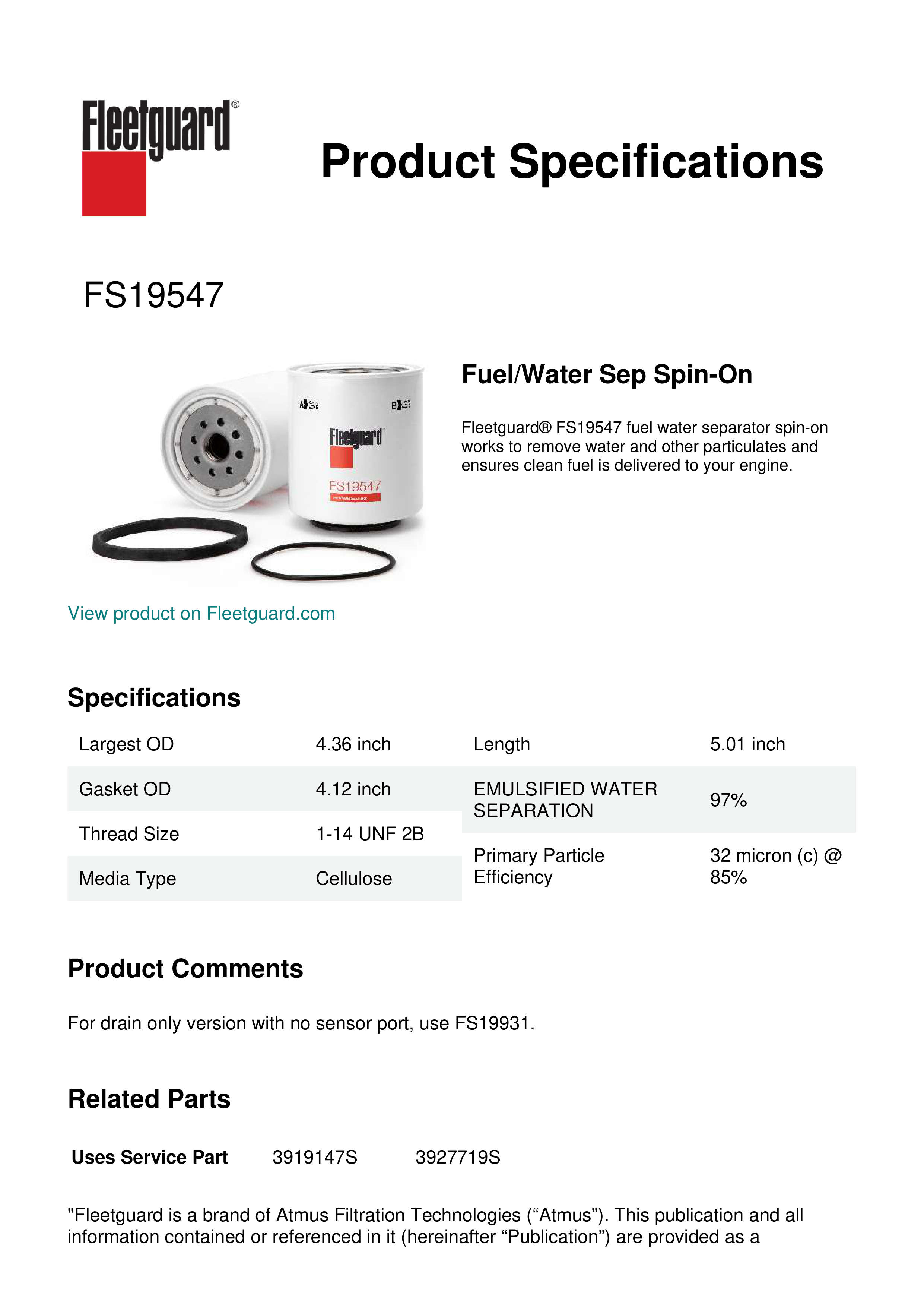 Fleetguard® FS19547 fuel water separator spin-on works to remove water and other particulates and ensures clean fuel is delivered to your engine.Specification