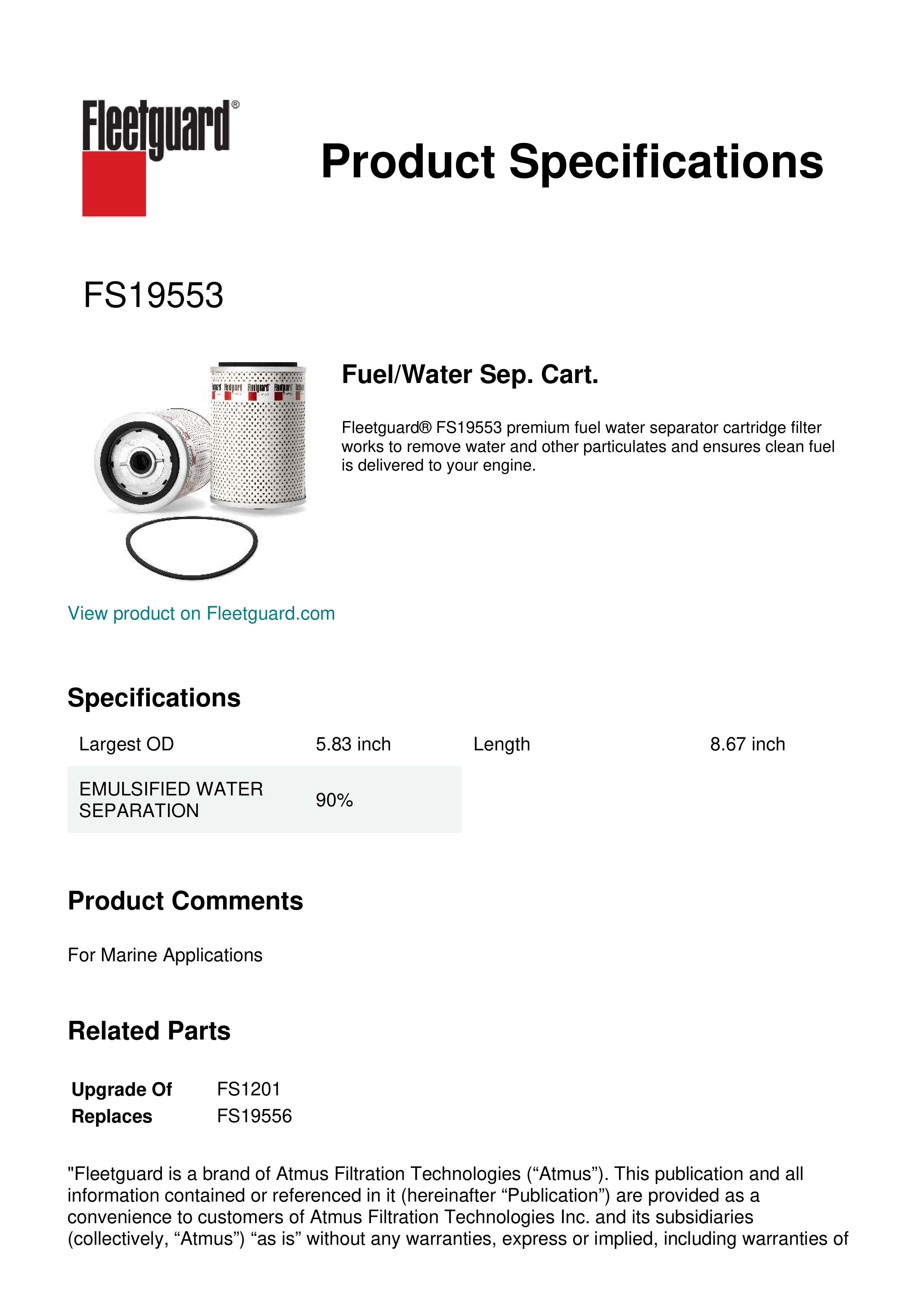 Fleetguard® FS19553 premium fuel water separator cartridge filter works to remove water and other particulates and ensures clean fuel is delivered to your engine.Specification