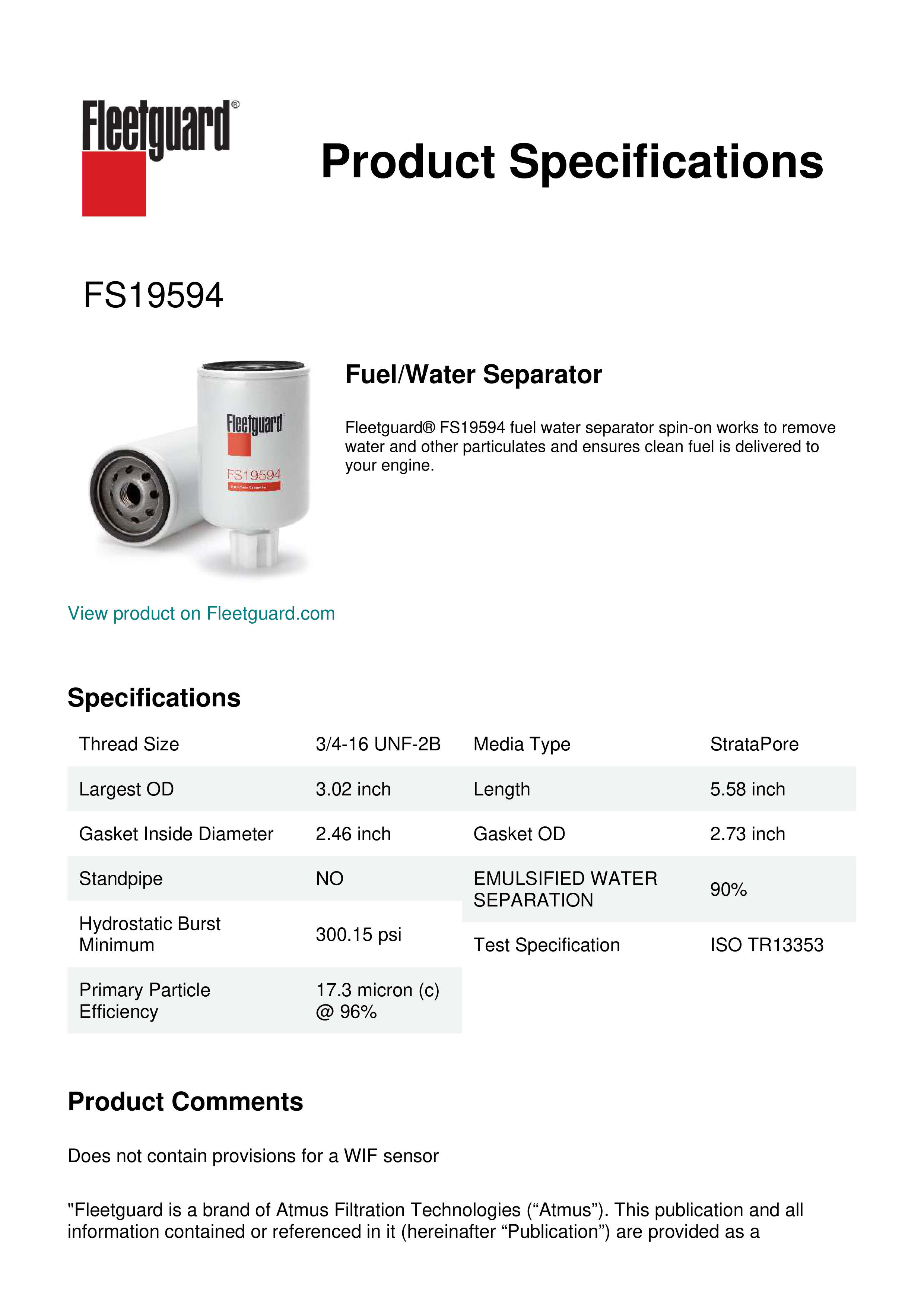 Fleetguard® FS19594 fuel water separator spin-on works to remove water and other particulates and ensures clean fuel is delivered to your engine.Specification