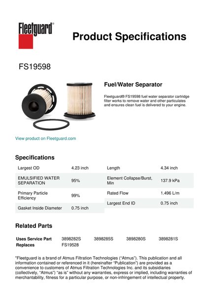 Fleetguard® FS19598 fuel water separator cartridge filter works to remove water and other particulates and ensures clean fuel is delivered to your engine.Specification