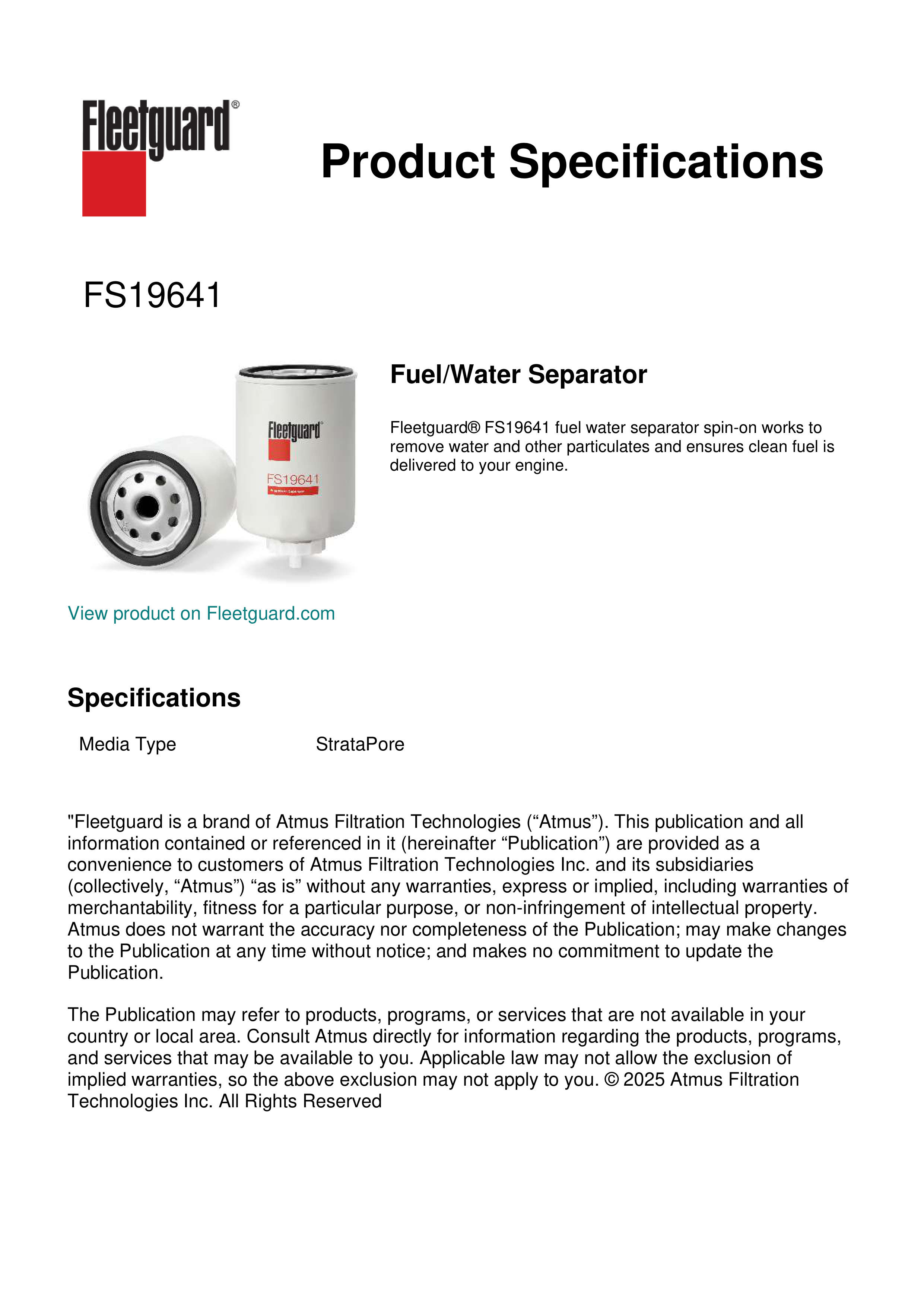 Fleetguard® FS19641 fuel water separator spin-on works to remove water and other particulates and ensures clean fuel is delivered to your engine.Specification