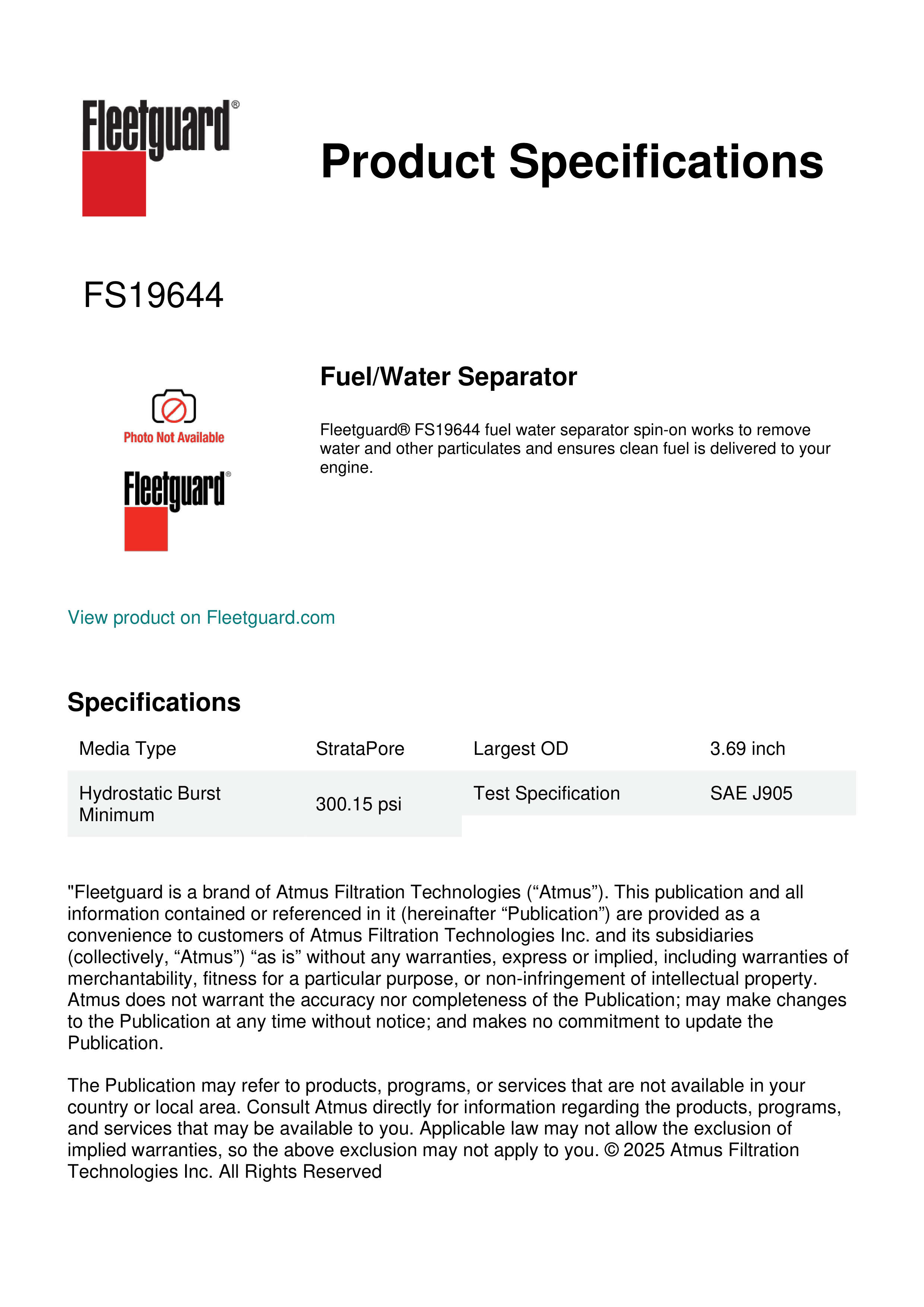 Fleetguard® FS19644 fuel water separator spin-on works to remove water and other particulates and ensures clean fuel is delivered to your engine.Specification