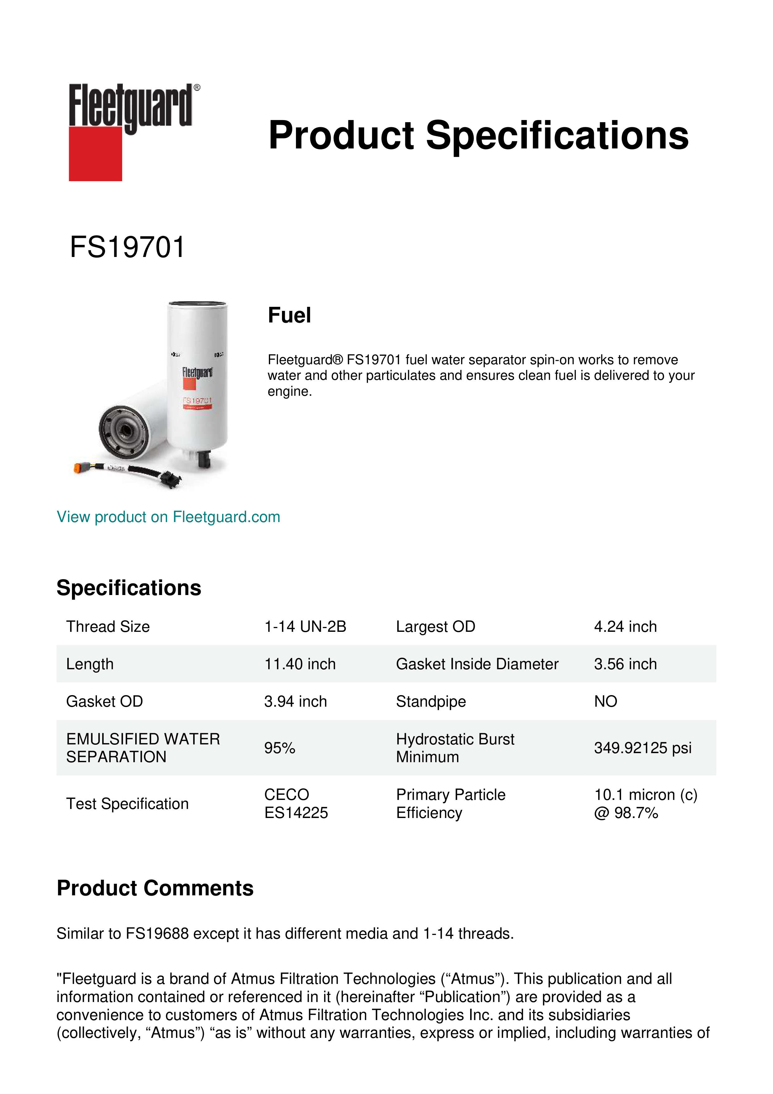 Fleetguard® FS19701 fuel water separator spin-on works to remove water and other particulates and ensures clean fuel is delivered to your engine.Specification