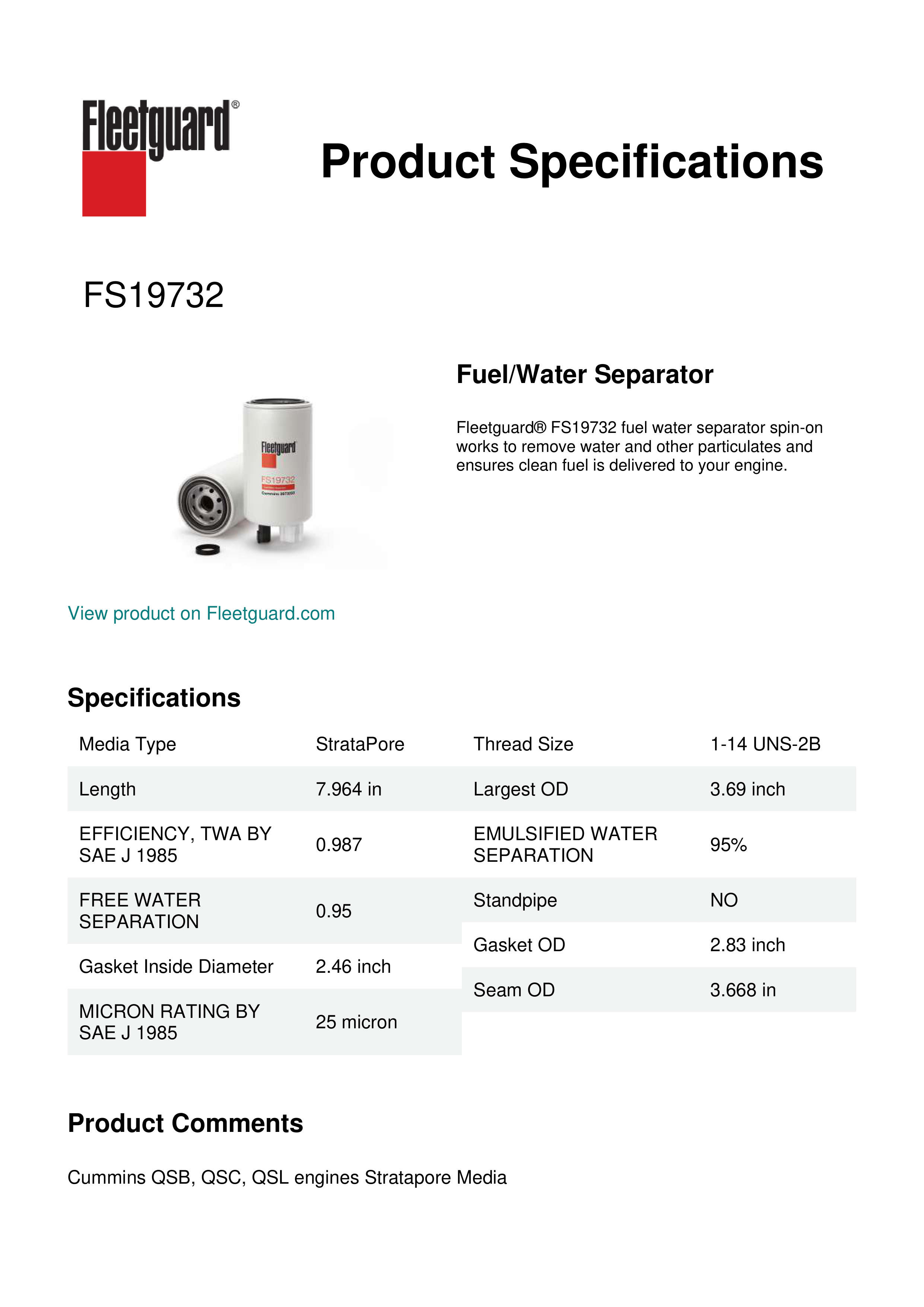 Fleetguard® FS19732 fuel water separator spin-on works to remove water and other particulates and ensures clean fuel is delivered to your engine.Specification