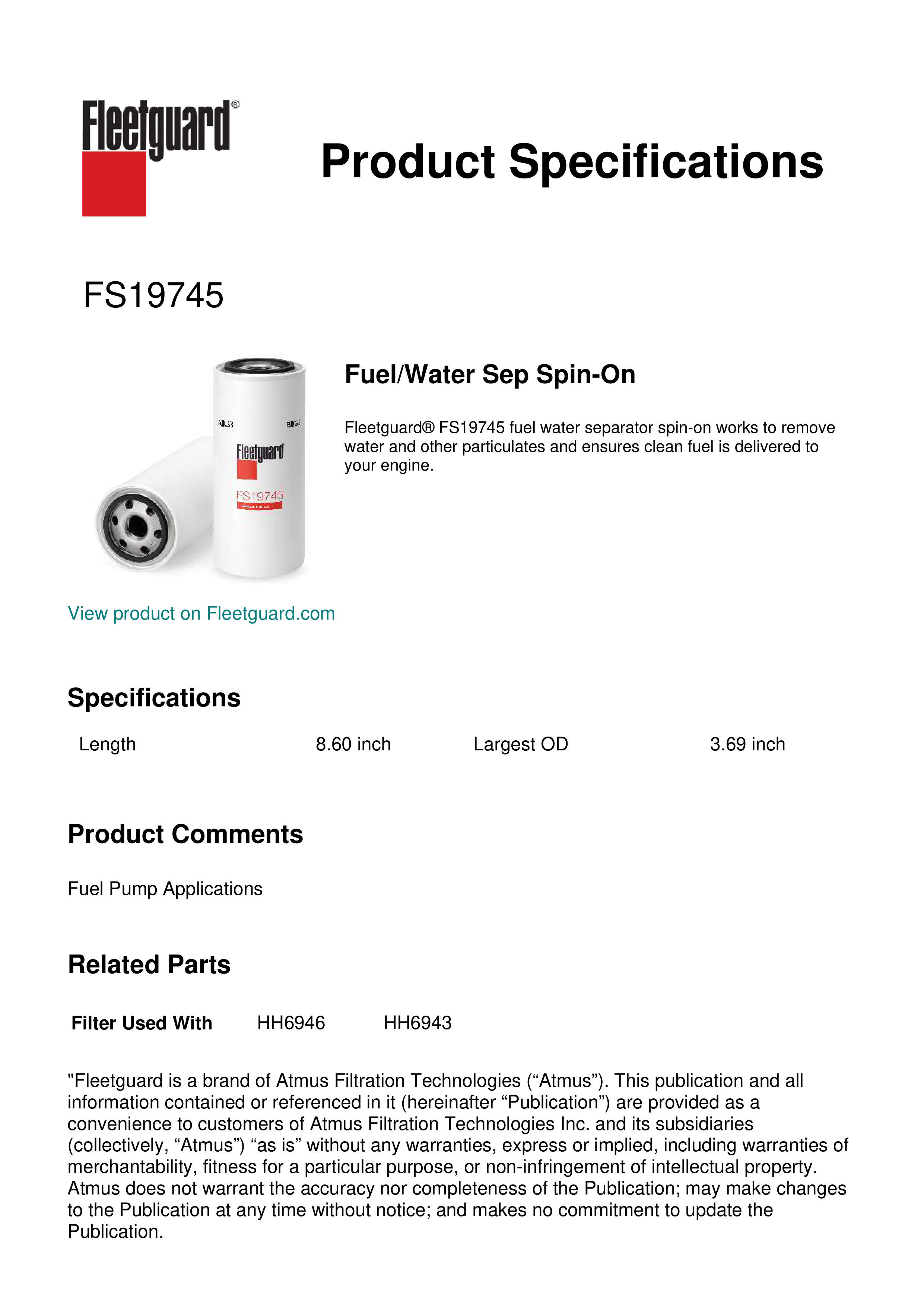 Fleetguard® FS19745 fuel water separator spin-on works to remove water and other particulates and ensures clean fuel is delivered to your engine.Specification
