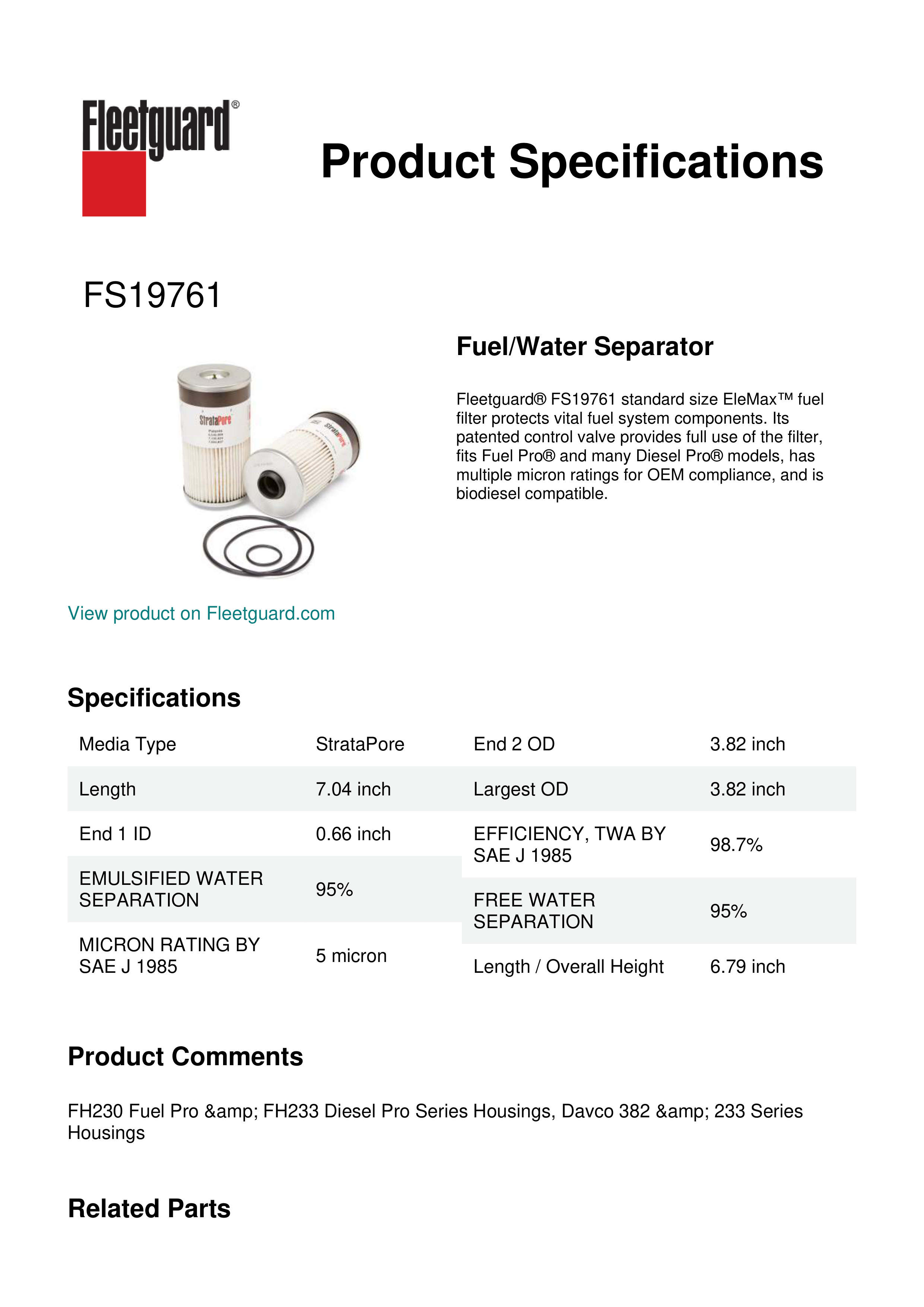 Fleetguard® FS19761 standard size EleMax™ fuel filter protects vital fuel system components. Its patented control valve provides full use of the filter, fits Fuel Pro® and many Diesel Pro® models, has multiple micron ratings for OEM compliance, and is biodiesel compatible.Specification