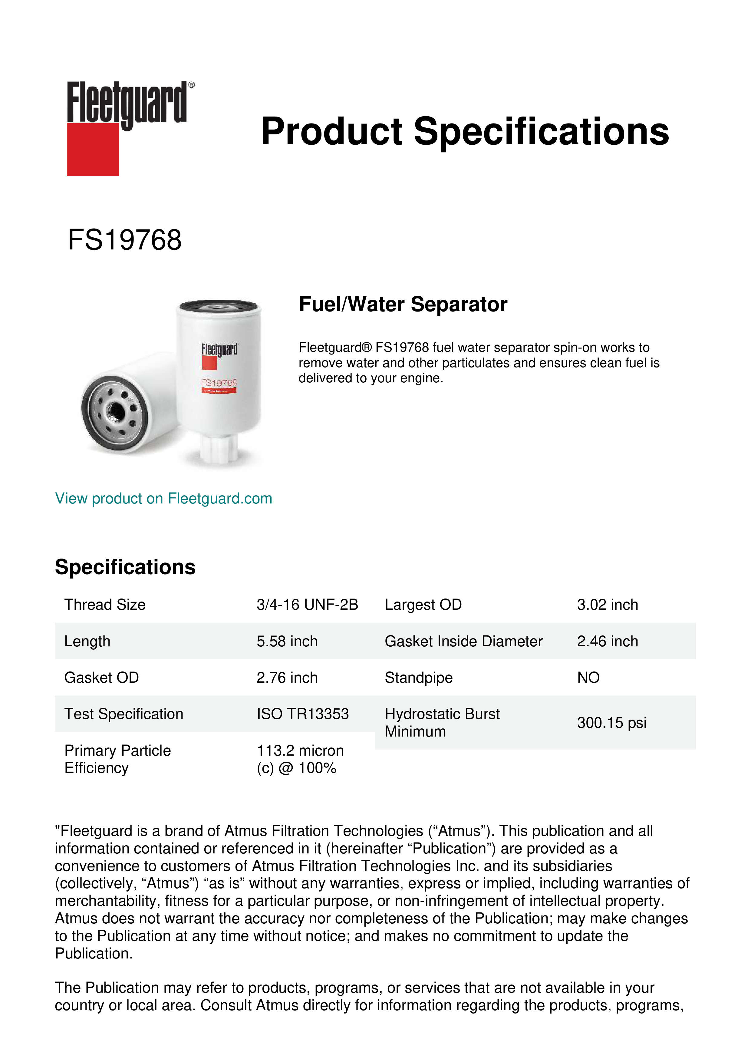 Fleetguard® FS19768 fuel water separator spin-on works to remove water and other particulates and ensures clean fuel is delivered to your engine.Specification