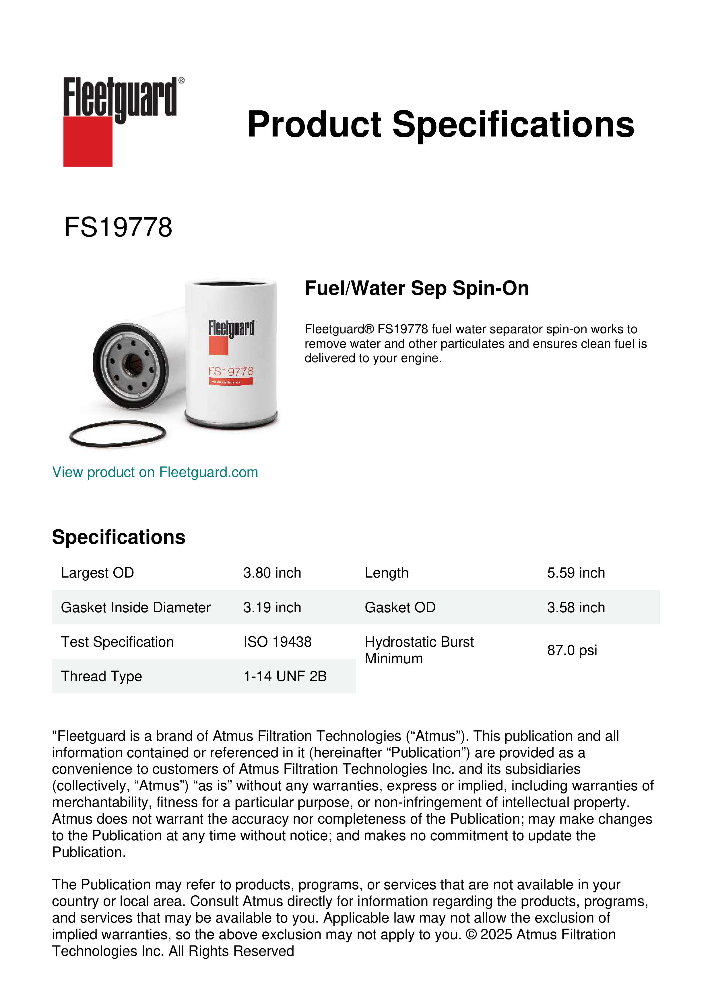 Fleetguard® FS19778 fuel water separator spin-on works to remove water and other particulates and ensures clean fuel is delivered to your engine.Specification