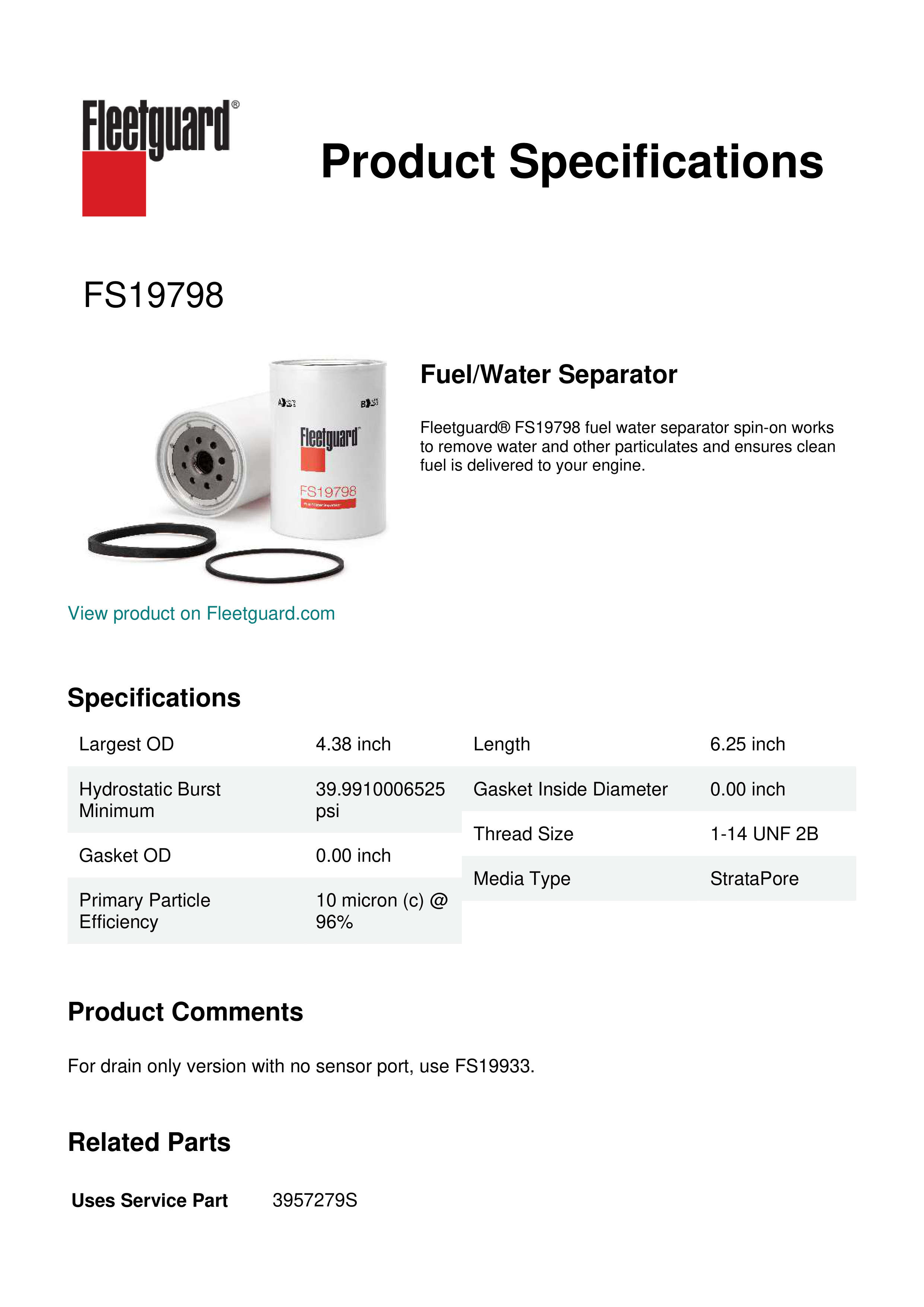 Fleetguard® FS19798 fuel water separator spin-on works to remove water and other particulates and ensures clean fuel is delivered to your engine.Specification