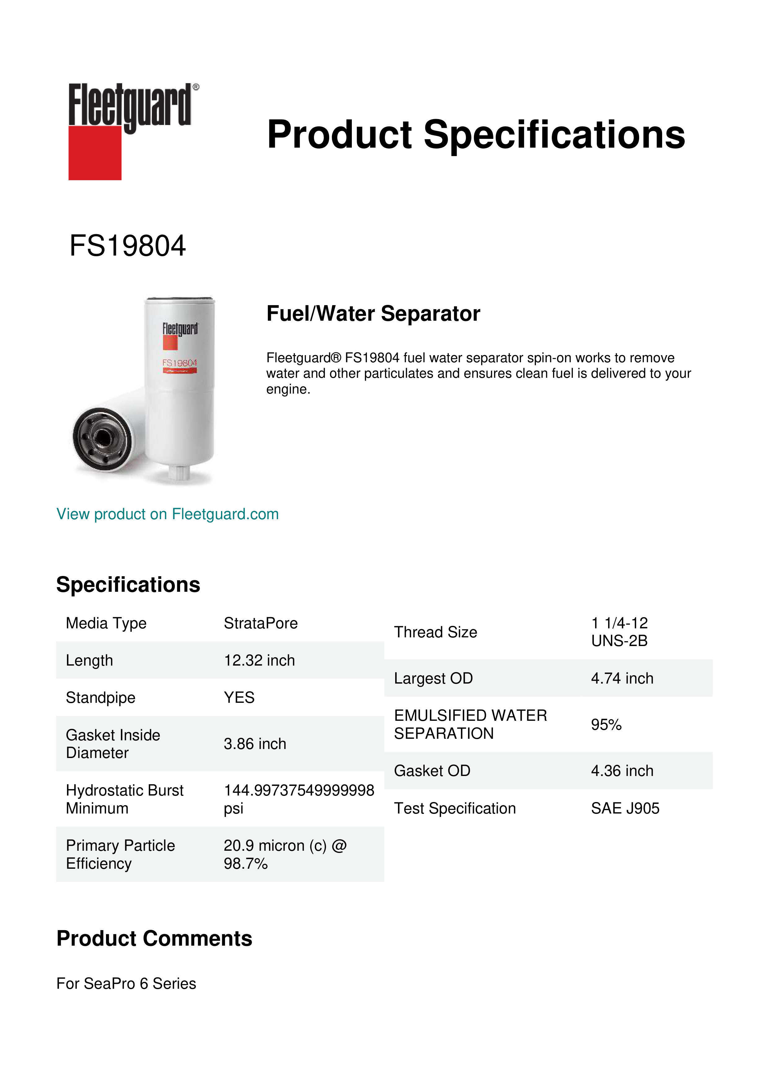 Fleetguard® FS19804 fuel water separator spin-on works to remove water and other particulates and ensures clean fuel is delivered to your engine.Specification