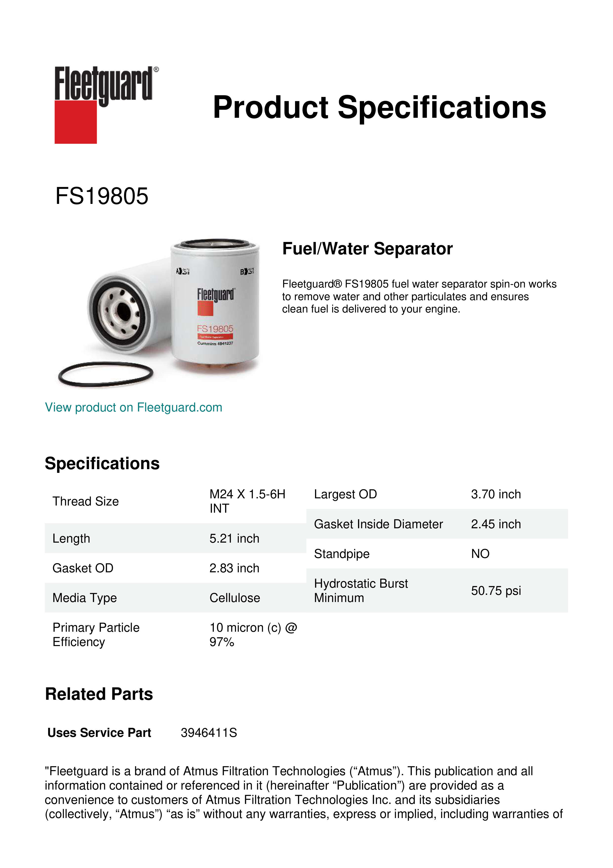 Fleetguard® FS19805 fuel water separator spin-on works to remove water and other particulates and ensures clean fuel is delivered to your engine.Specification