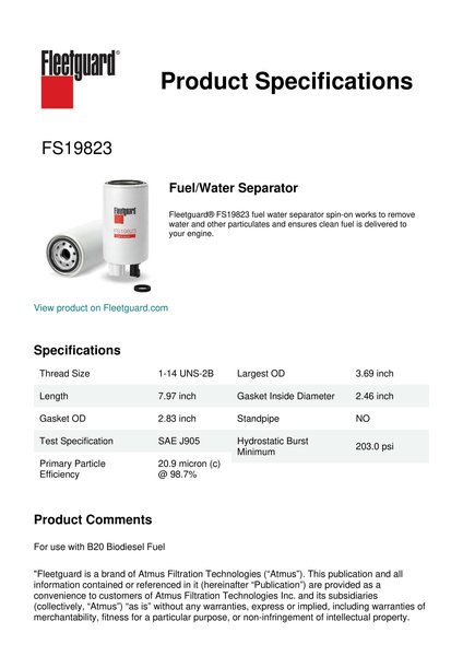 Fleetguard® FS19823 fuel water separator spin-on works to remove water and other particulates and ensures clean fuel is delivered to your engine.Specification