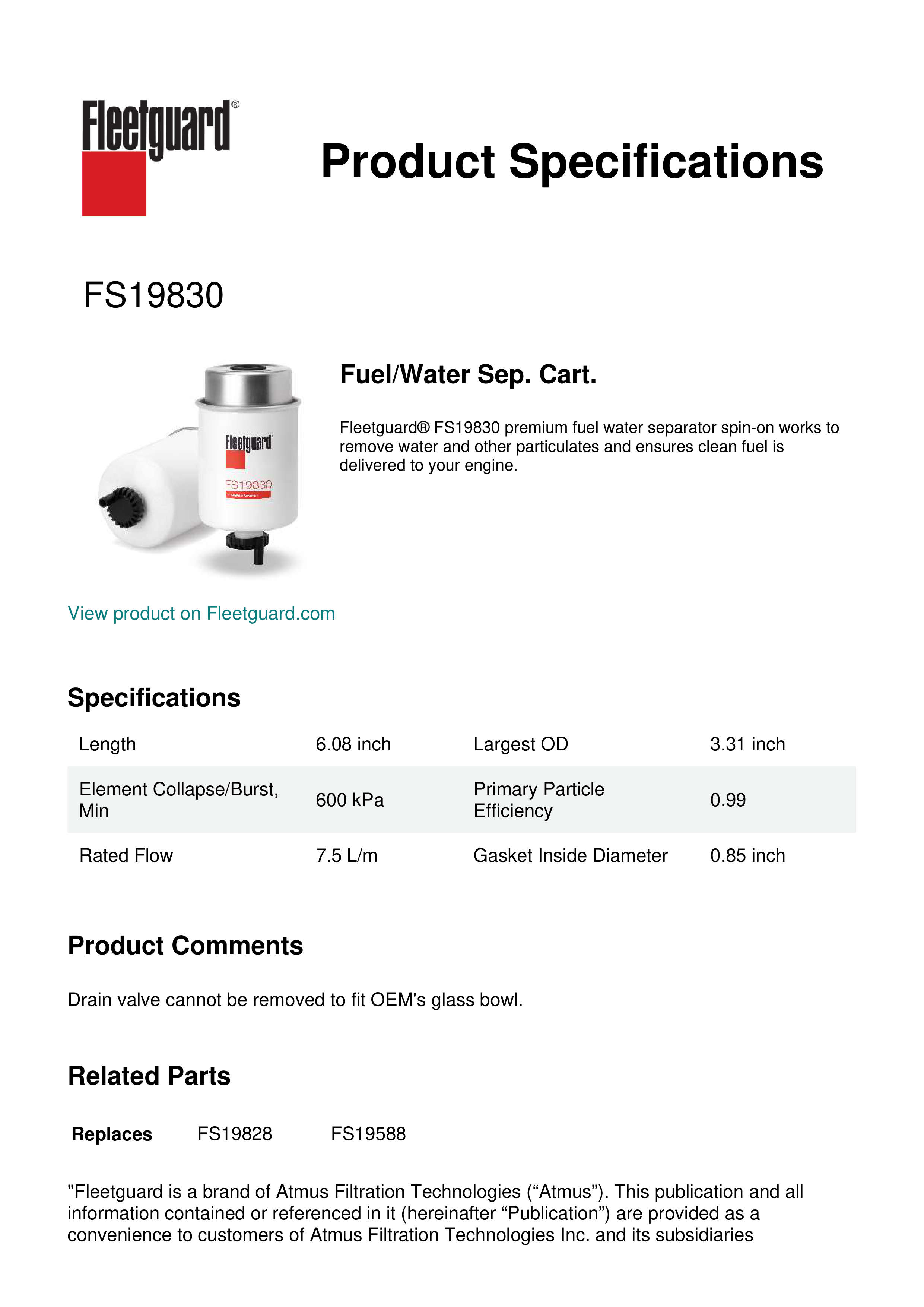 Fleetguard® FS19830 premium fuel water separator spin-on works to remove water and other particulates and ensures clean fuel is delivered to your engine.Specification