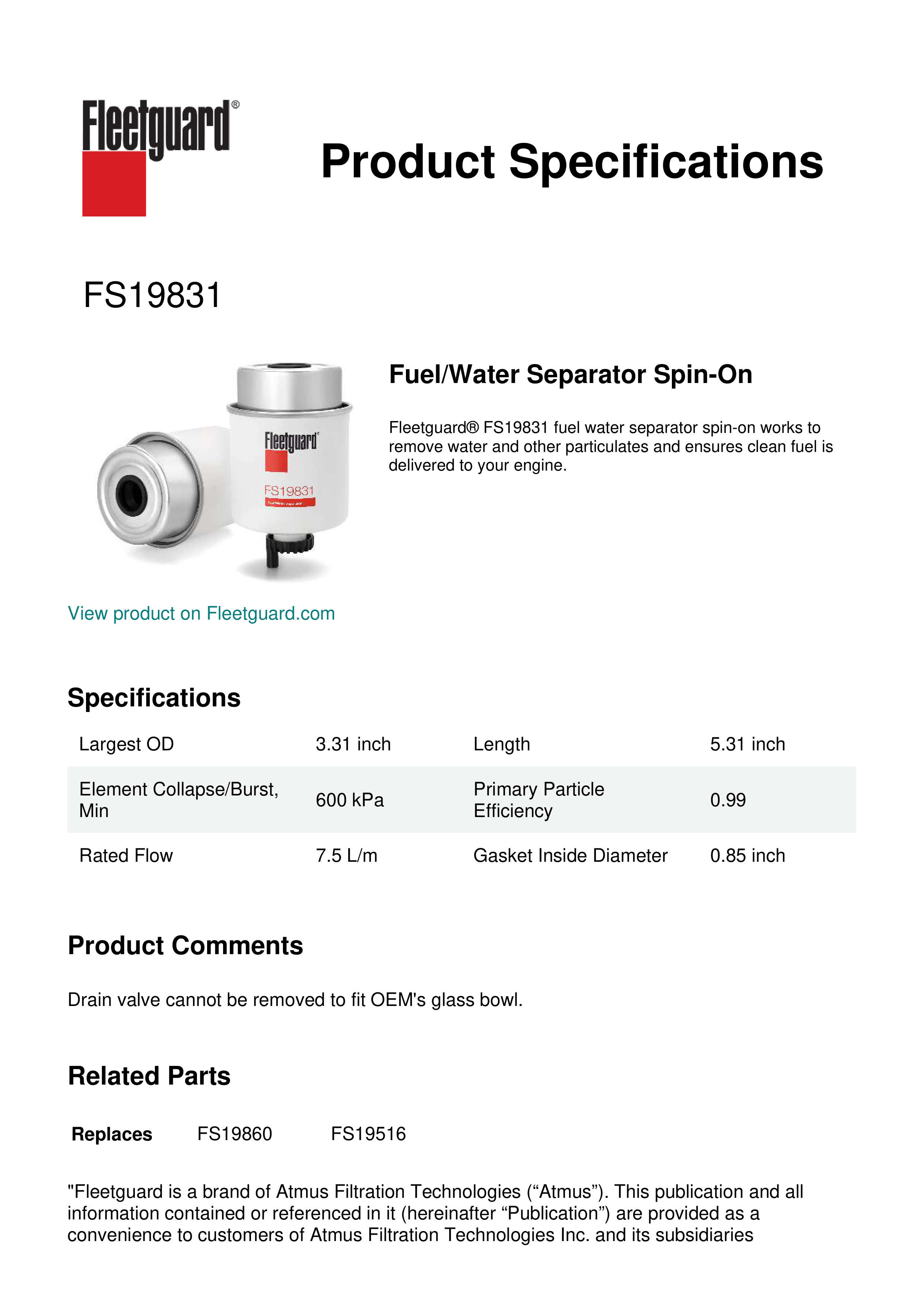 Fleetguard® FS19532 fuel water separator spin-on works to remove water and other particulates and ensures clean fuel is delivered to your engine.Specification