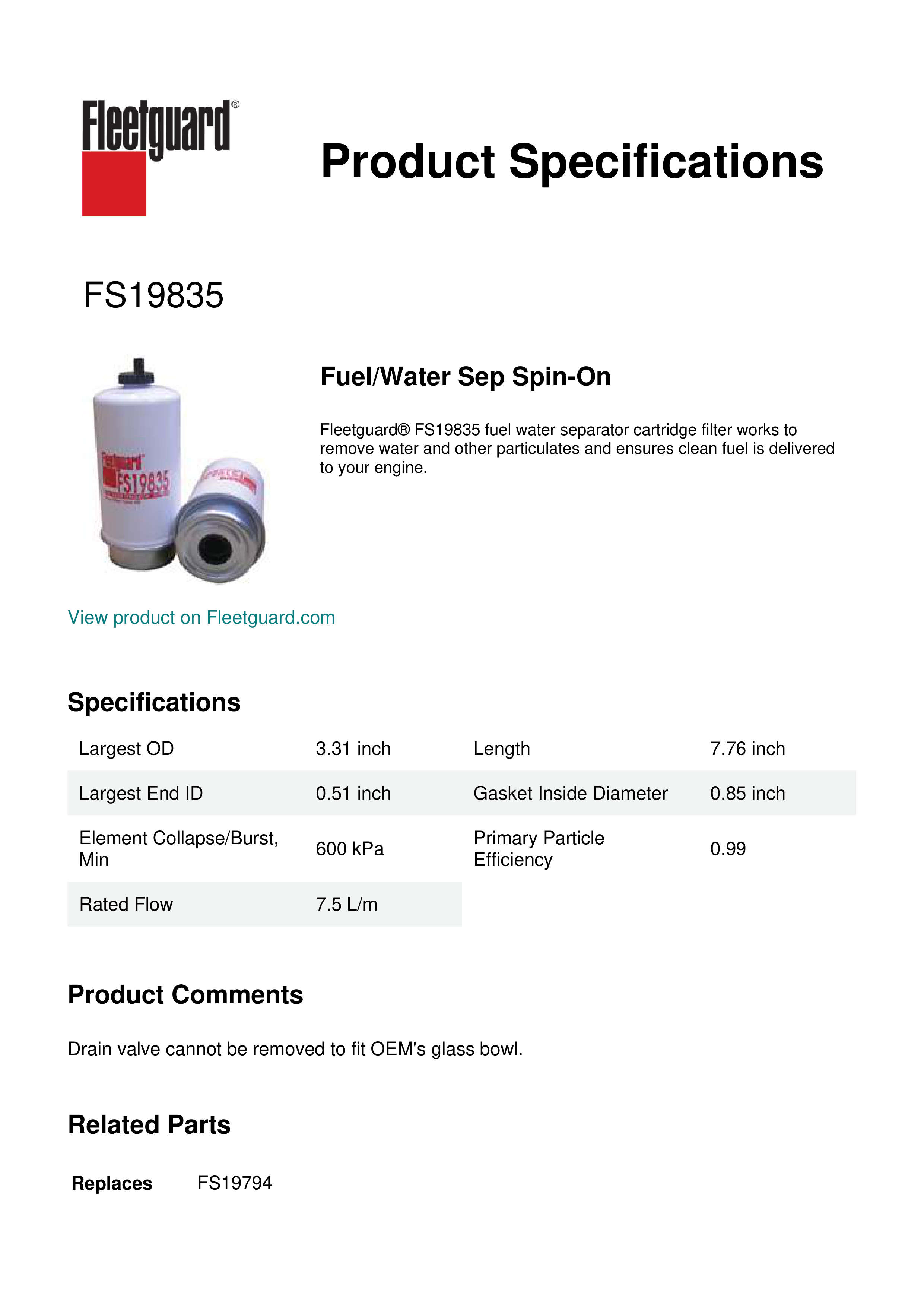 Fleetguard® FS19835 fuel water separator cartridge filter works to remove water and other particulates and ensures clean fuel is delivered to your engine.Specification