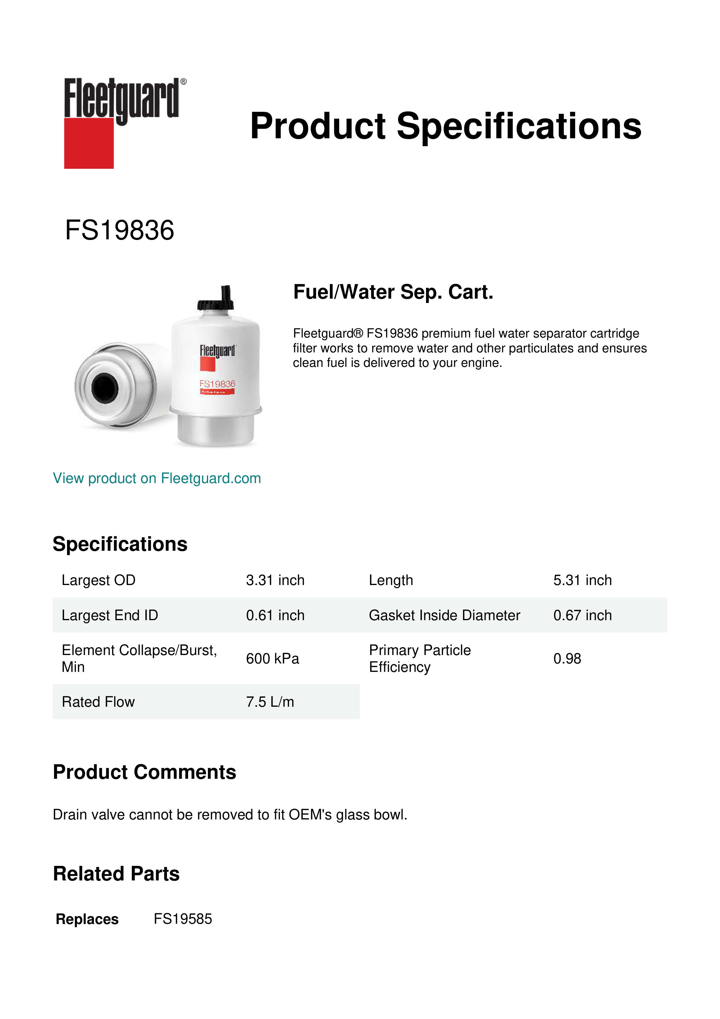 Fleetguard® FS19836 premium fuel water separator cartridge filter works to remove water and other particulates and ensures clean fuel is delivered to your engine.Specification