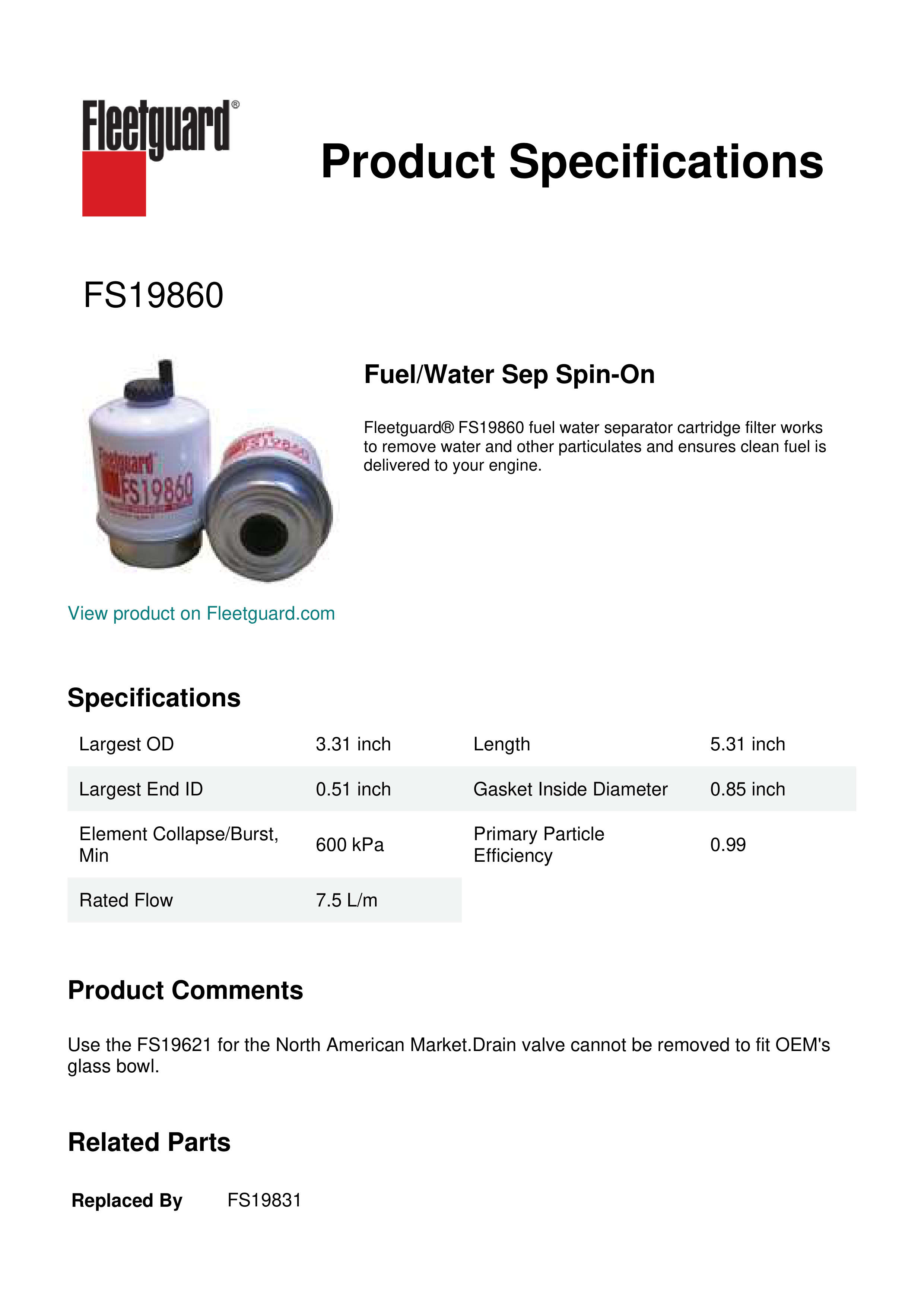 Fleetguard® FS19860 fuel water separator cartridge filter works to remove water and other particulates and ensures clean fuel is delivered to your engine.Specification